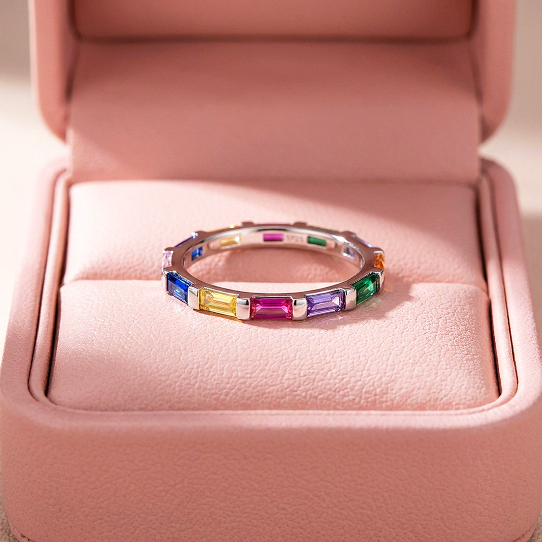 • A rainbow of baguette stones in an eternity setting that catches light from every angle — effortlessly bold without being loud