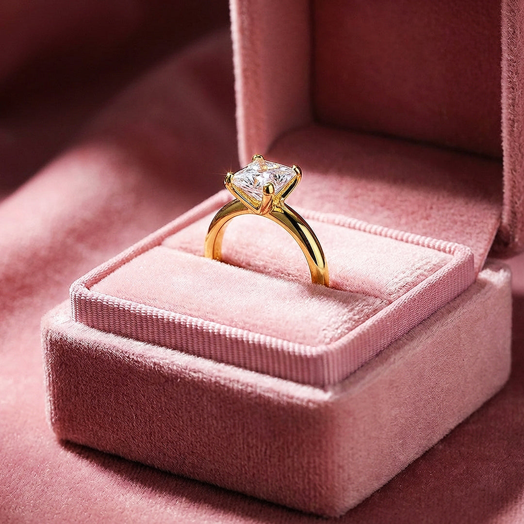 The princess cut is one of the most searched stone shapes in fine jewelry — and on PRM7183, it's easy to see why. A 1 carat square princess-cut Moissanite sits in a four-prong yellow gold setting above a sleek, unadorned band, its sharp geometric corners catching light with a distinctly different quality to round stones. Structured, precise, and quietly confident — this is the ring for someone who knows exactly what she wants and doesn't need embellishment to make the point.