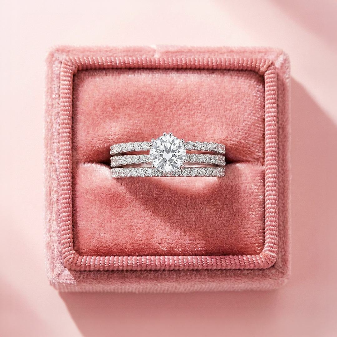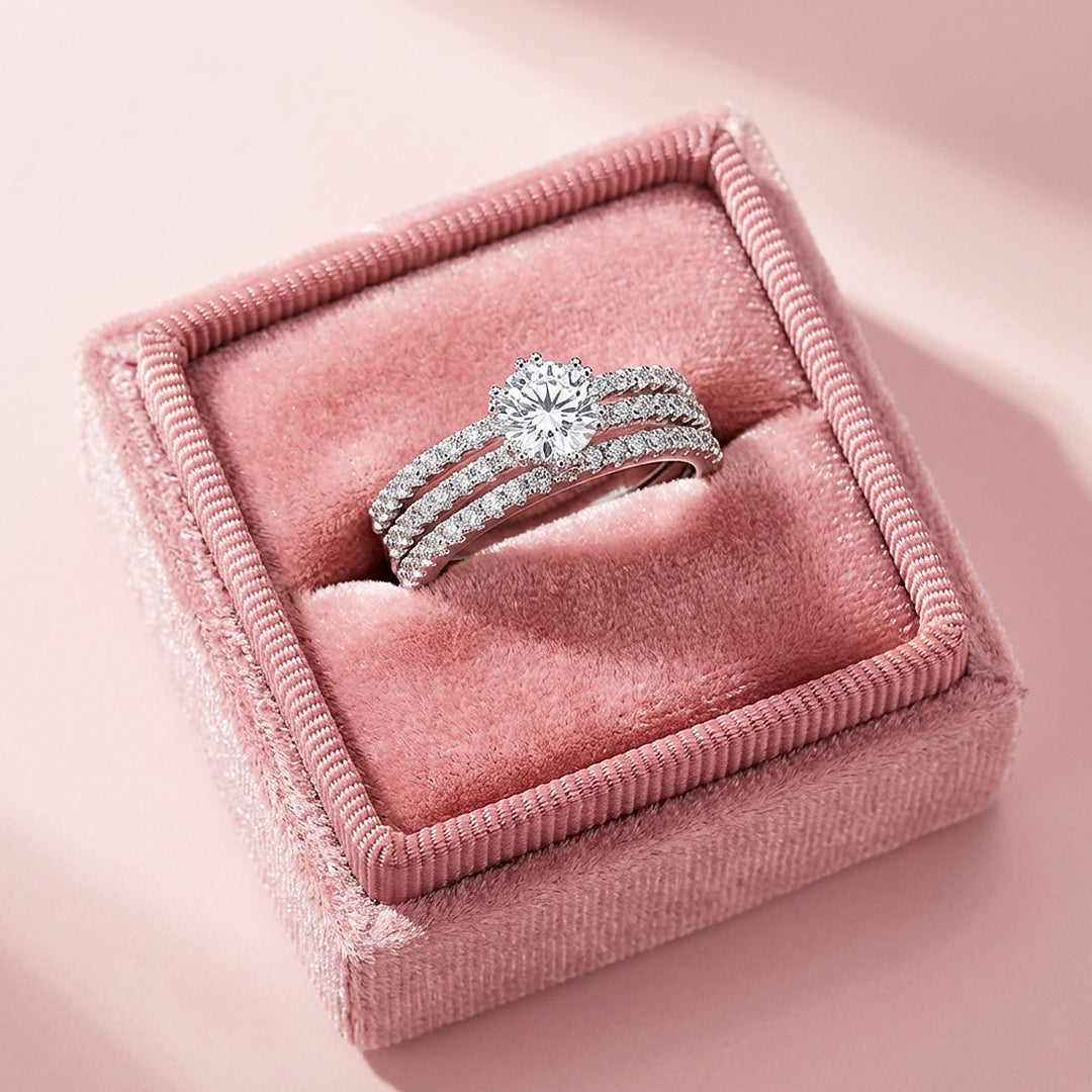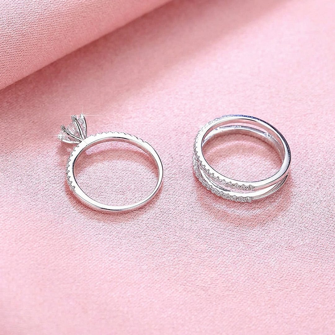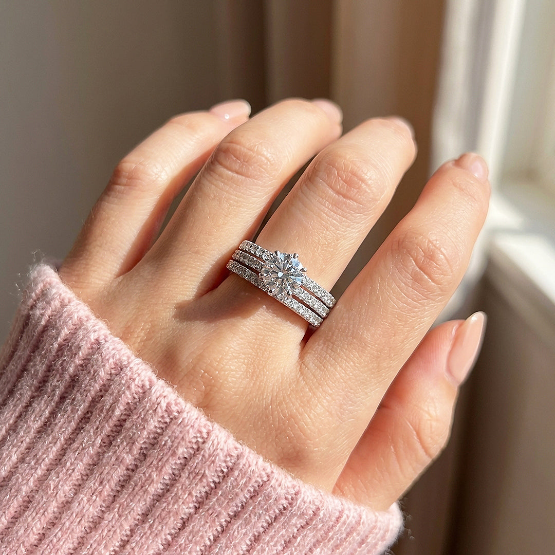 PRM7174 is styled as a bridal set but designed to be worn as one — three bands stacked together, each lined with Diamond Simulant pavé, converging beneath a 0.5 carat Moissanite center held in a six-prong setting. The layered band effect creates far more visual weight than a single ring could achieve, making the center stone look elevated and purposeful rather than solitary. In white gold-plated 925 sterling silver, the whole composition reads as polished and complete straight out of the box.