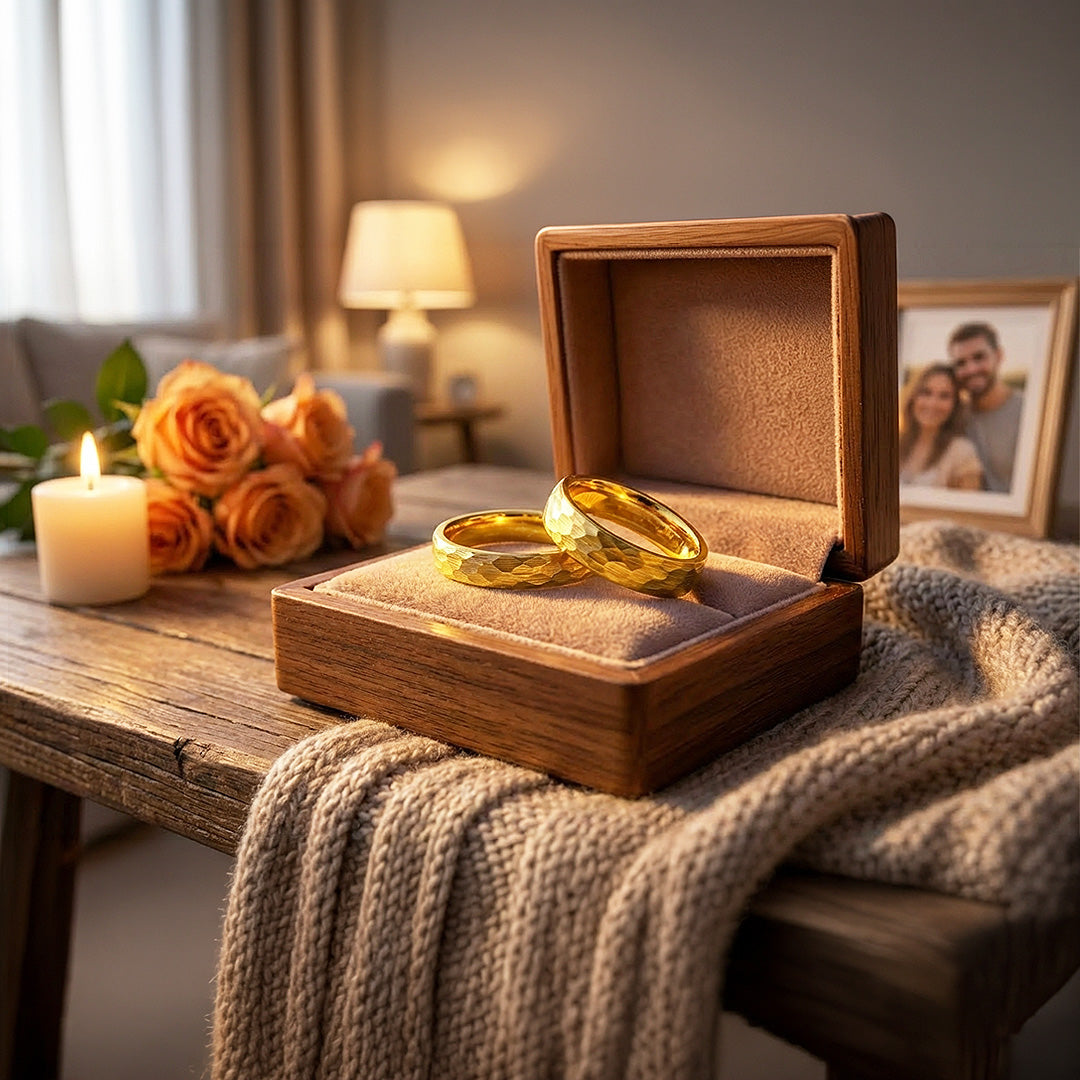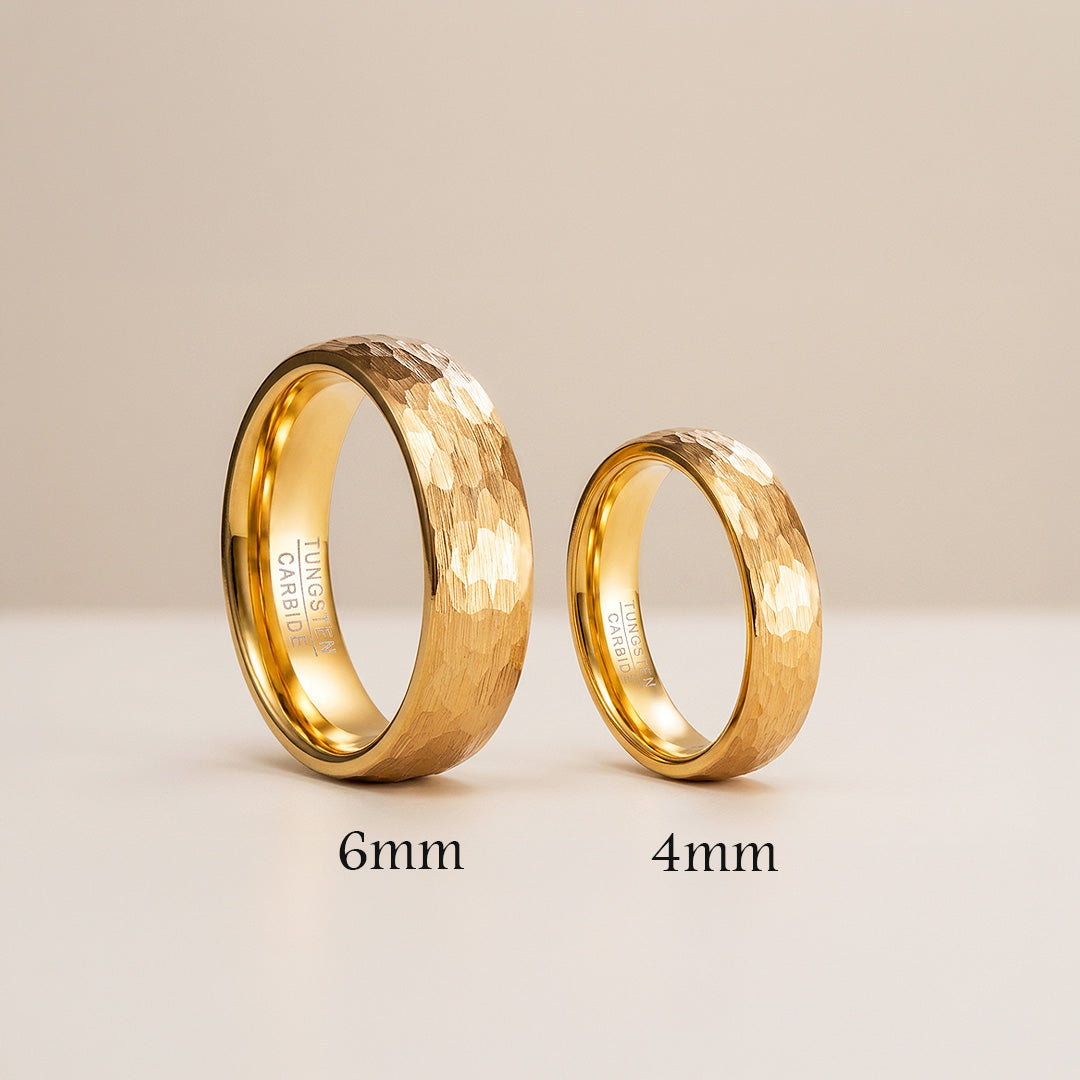 The Pure Devotion Tungsten Ring reflects strength and enduring commitment through its rich gold finish and distinctive hammered texture. The sculpted surface catches light from every angle, creating a subtle interplay of brilliance and depth that enhances its refined presence. Crafted from premium tungsten carbide, the ring offers exceptional durability while maintaining a polished interior for everyday comfort. Elegant yet resilient, this tungsten couple ring is designed to represent lasting devotion and modern sophistication.