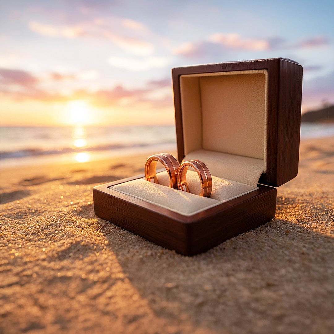 The Santa Tungsten Ring blends modern structure with warm rose gold elegance, creating a refined band designed for lasting significance. Its brushed centre surface is framed by polished rose gold edges, producing a subtle contrast that highlights the ring’s clean lines and balanced proportions. The result is a design that feels contemporary yet timeless. Crafted from premium tungsten carbide, this tungsten couple ring offers impressive durability while maintaining a sophisticated appearance suitable for both everyday wear and meaningful occasions.