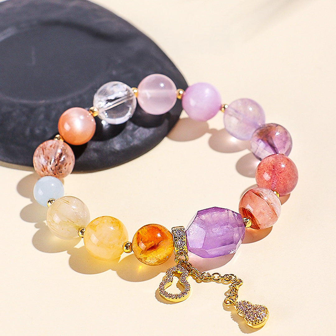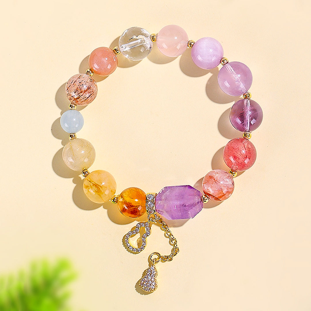 Awaken your inner goddess with the Goddess Radiance Bracelet – a stunning kaleidoscope of 15 powerful natural crystals, each radiating beauty, balance, and feminine energy. Every bead is hand-selected and polished to perfection, strung on a flexible elastic band that adjusts comfortably to fit all wrist sizes. Finished with a gold-accented charm and glistening crystal pendant, this bracelet is more than an accessory – it’s a wearable aura of positivity and elegance.
