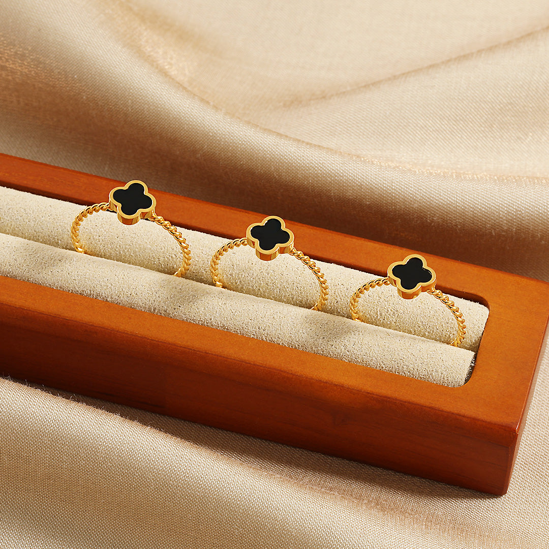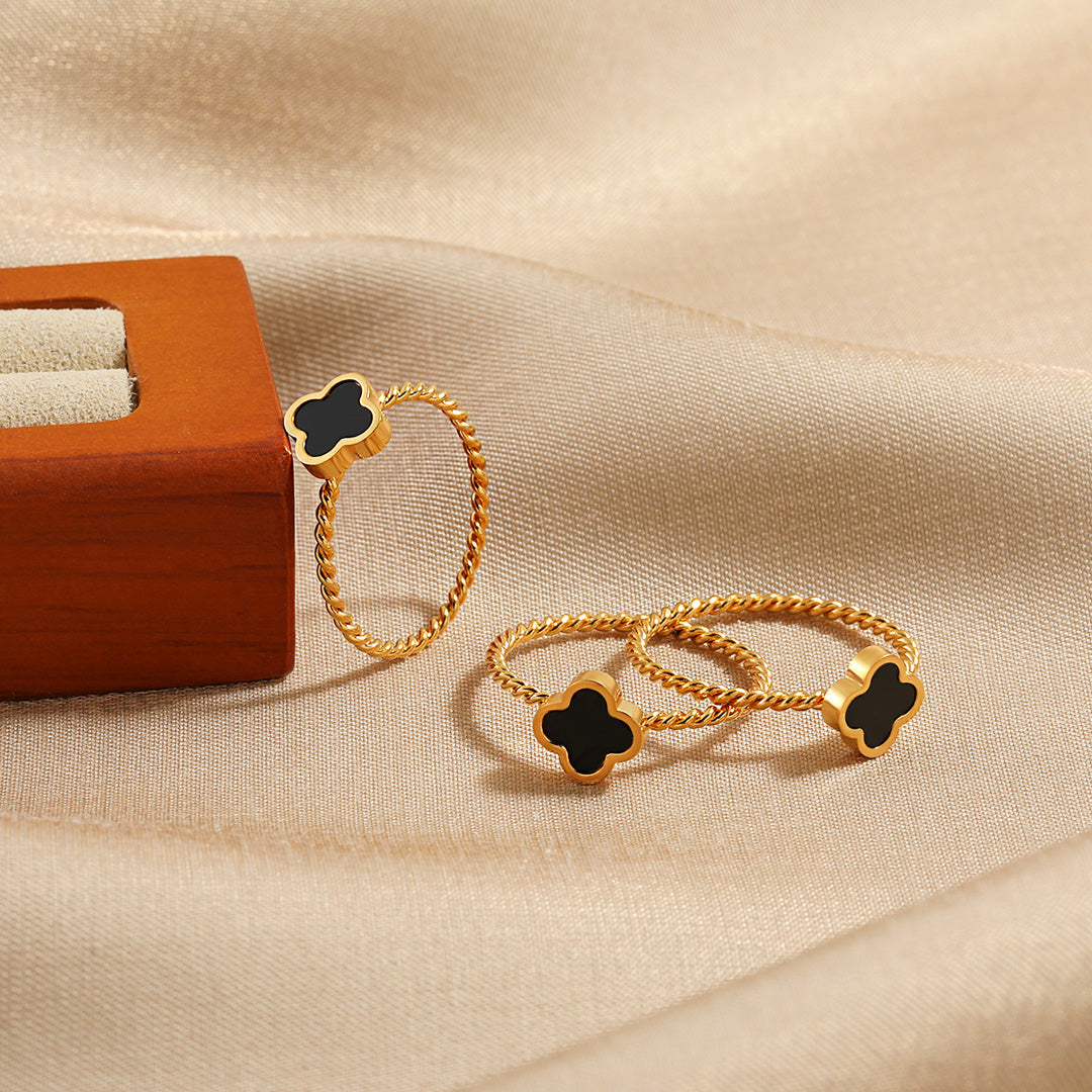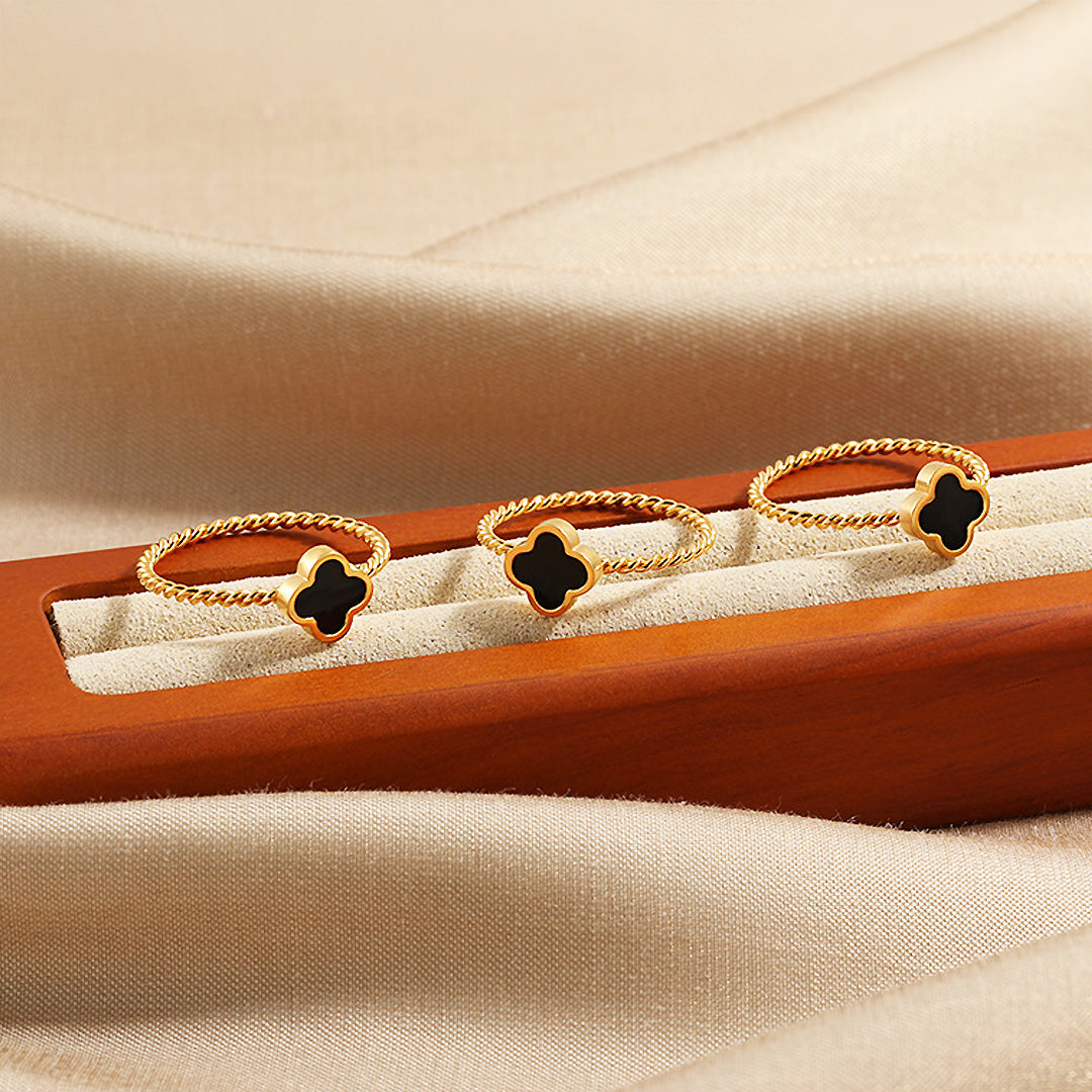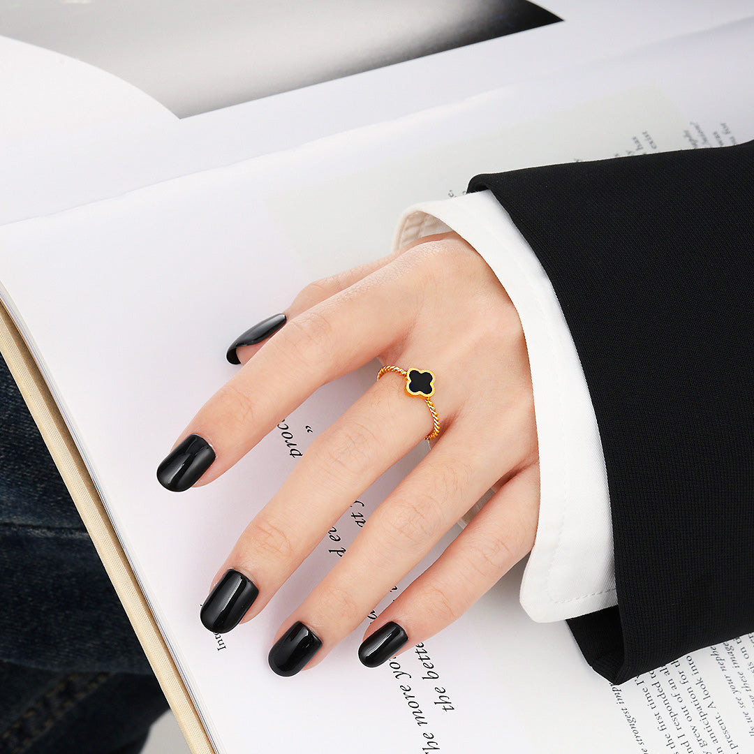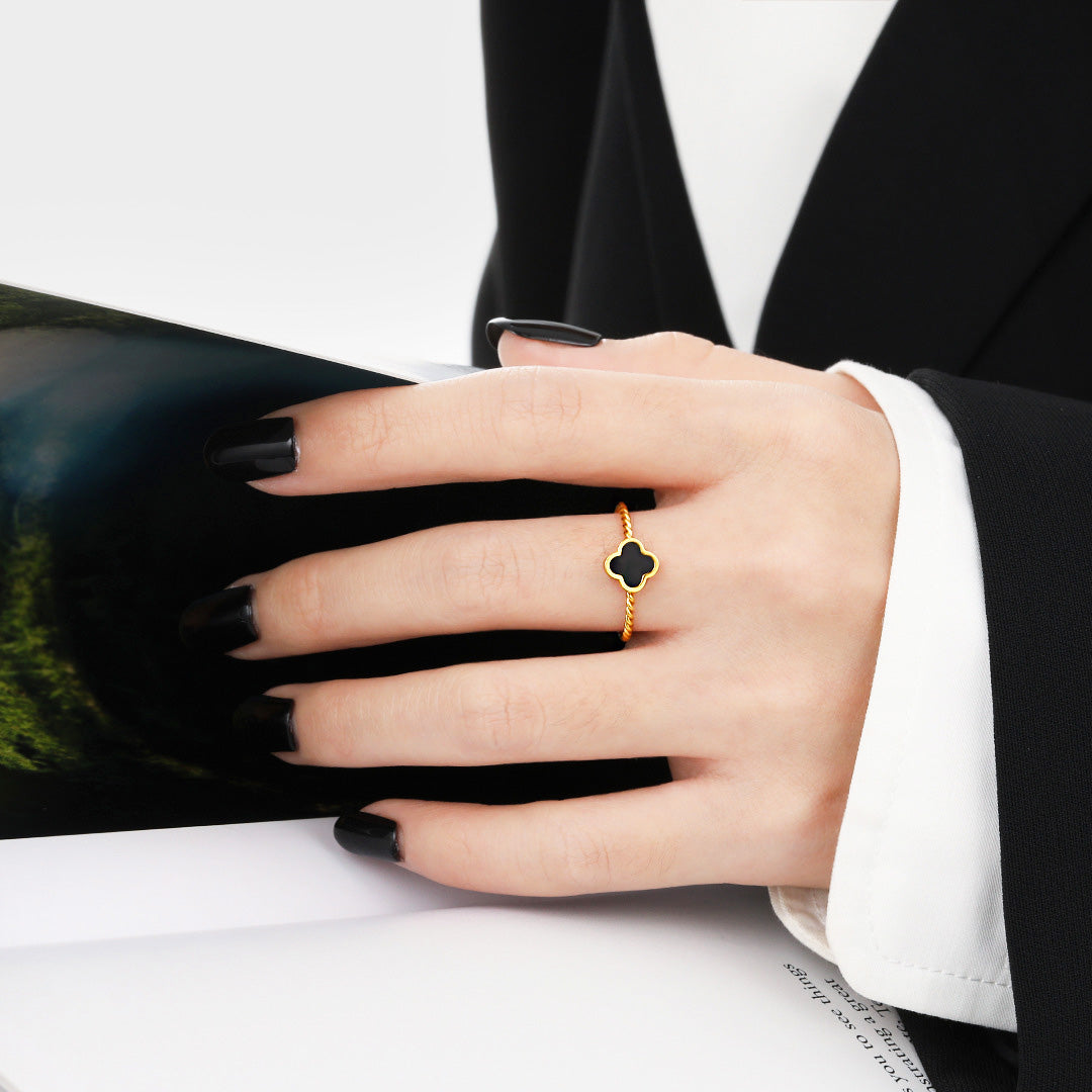 Bring timeless elegance to your everyday look with the Luxe5120 Ring, crafted from premium titanium steel for lasting beauty and strength. Its signature design features a black enamel clover set atop a twisted gold band, blending sophistication with modern minimalism. ✨