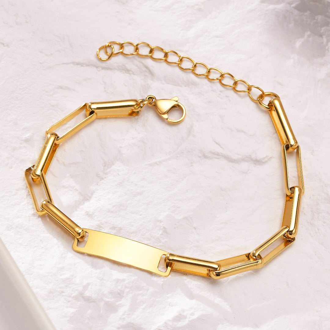 Define your style with the Luxe6473 Bar Link Bracelet, a chic and modern accessory. It features a bold central ID bar, perfect for engraving, nestled within a contemporary paperclip-style link chain.