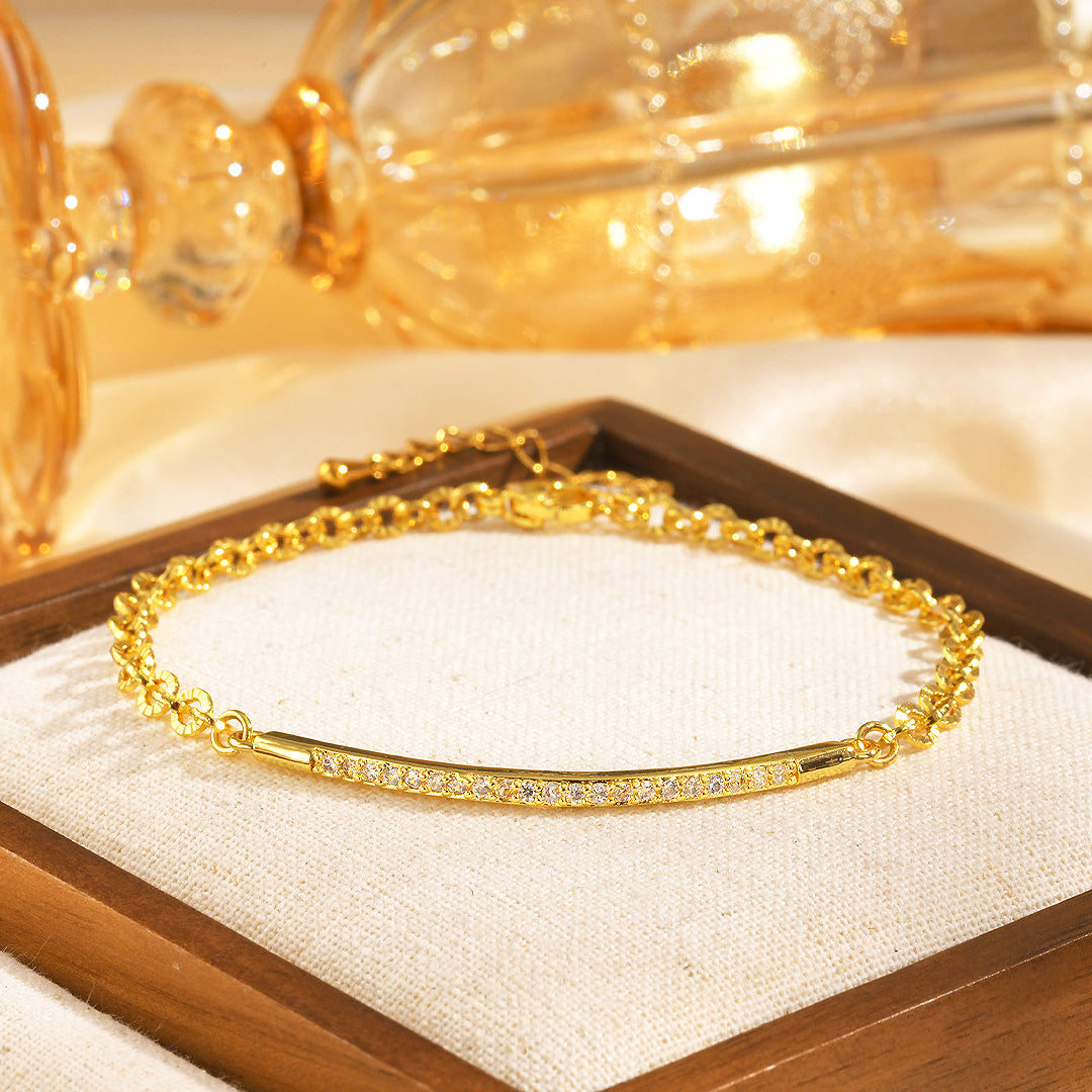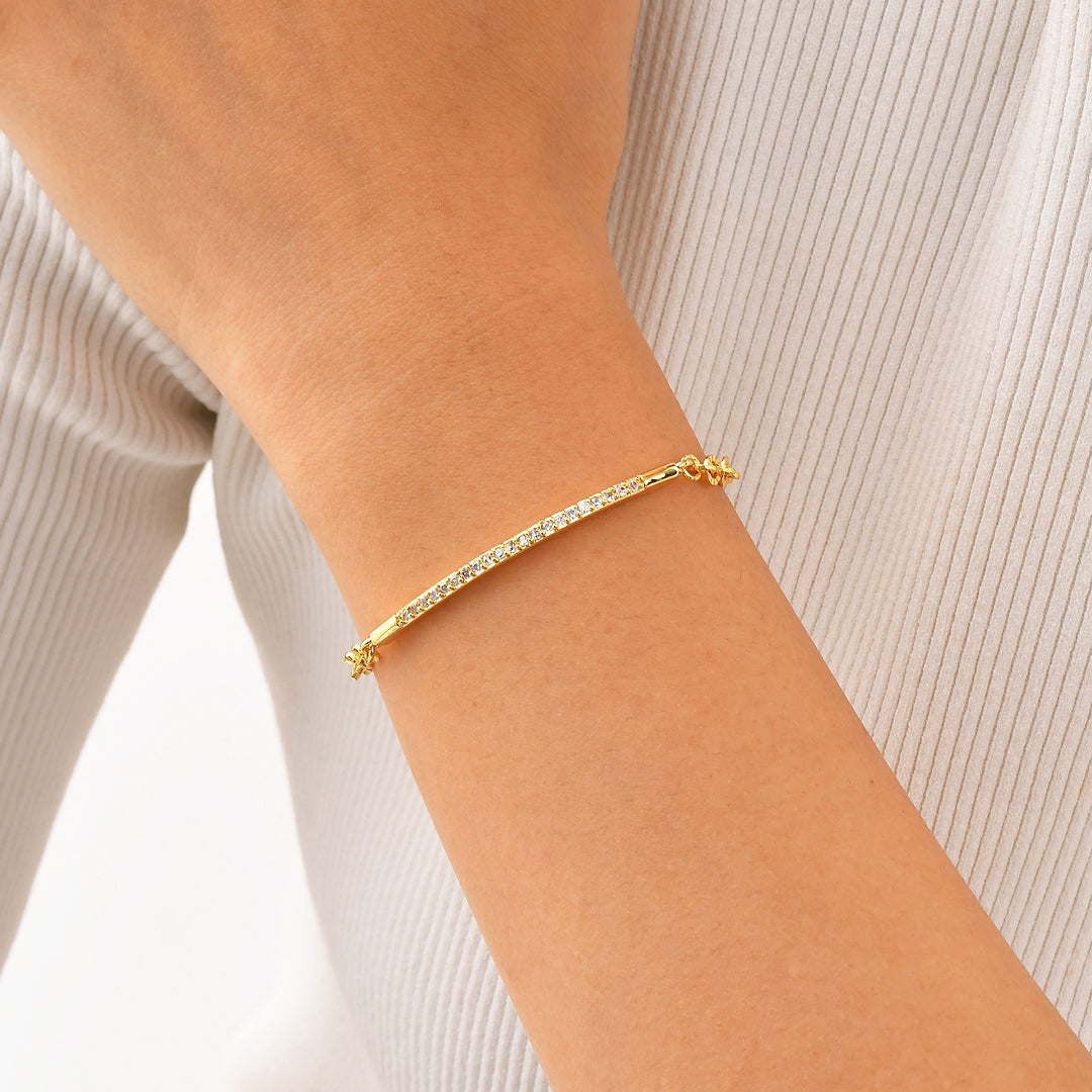 A slim, scintillating beauty designed to capture the light at every angle — the Luxe6480 Sleek Bar Luxe Bracelet exudes effortless sophistication with its minimalist bar silhouette and dainty floral-link chain. Dusted with rows of dazzling cubic zirconia and finished in luxurious 5-layer gold plating, it offers a modern luxe appeal that elevates any outfit, day or night.