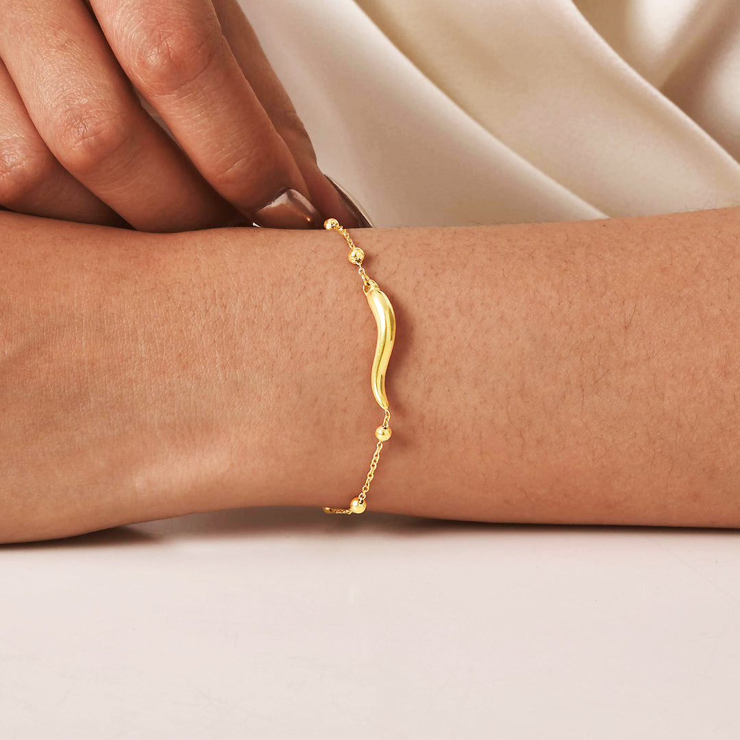 Graceful and poetic, the Luxe6481 Curve Luxe Bracelet is inspired by the fluid movement of liquid gold. Its sculptural curved bar sits delicately on a dainty beaded chain, creating an elegant piece that feels both modern and feminine. Crafted from premium stainless steel and finished with 5 layers of rich gold electroplating, it’s built to stay brilliantly lustrous — non-tarnish, hypoallergenic, and endlessly timeless.
