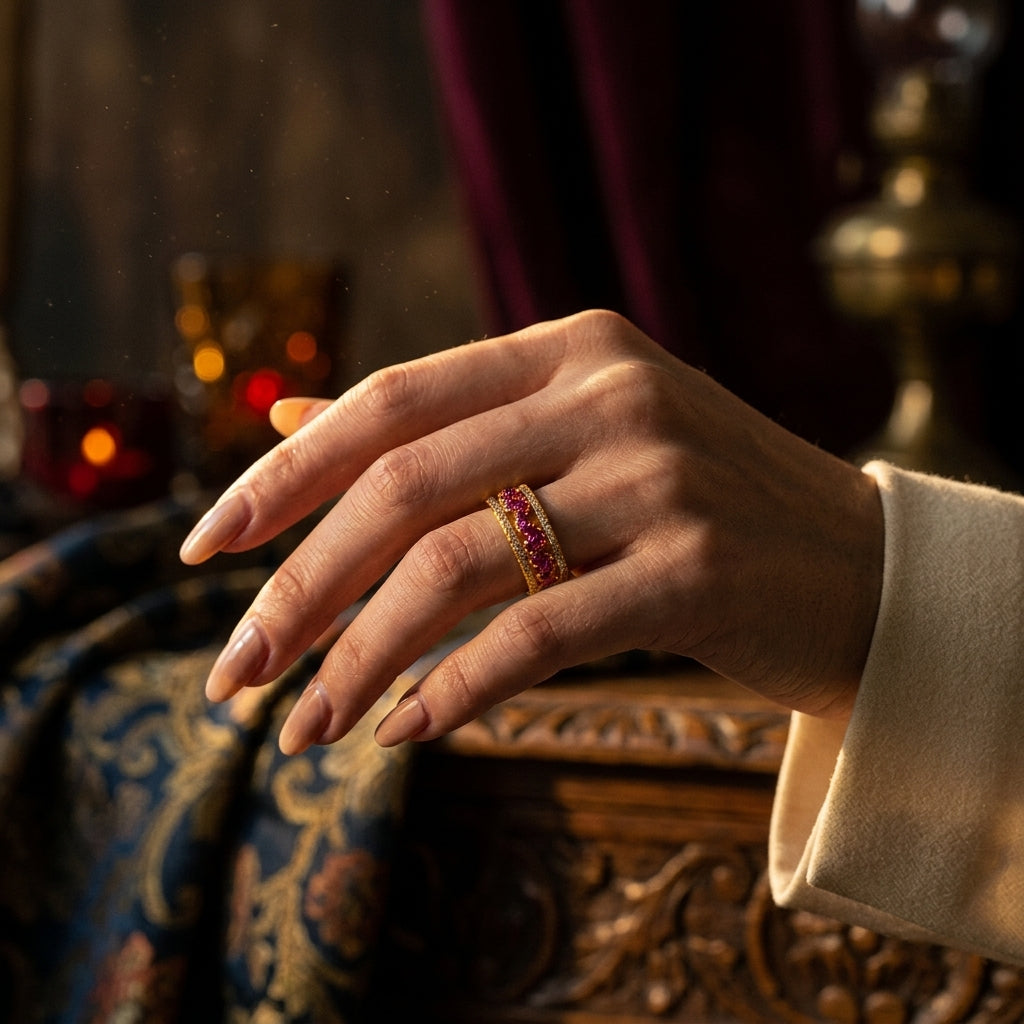 Make a bold, romantic statement with the Luxe5165, a ring that perfectly captures the balance between contemporary geometry and timeless charm. This architectural piece features a unique double-band design, where two shimmering rows of clear High-Brilliance Diamond Simulants frame a central gallery of vibrant, Ruby Red hearts. Each heart is meticulously set to catch the light, creating a rhythmic "pulse" of color and fire that stretches across the finger. The open-space silhouette provides a modern, airy feel, making it a standout piece that commands attention without being overbearing.