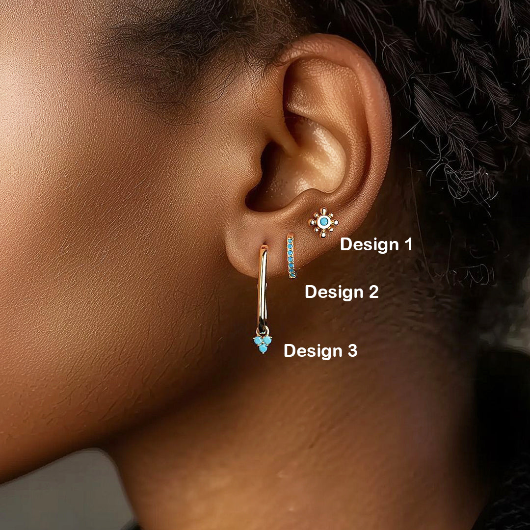 • Design 1 – A delicate flower stud with a vivid turquoise center, radiating youthful charm and femininity.