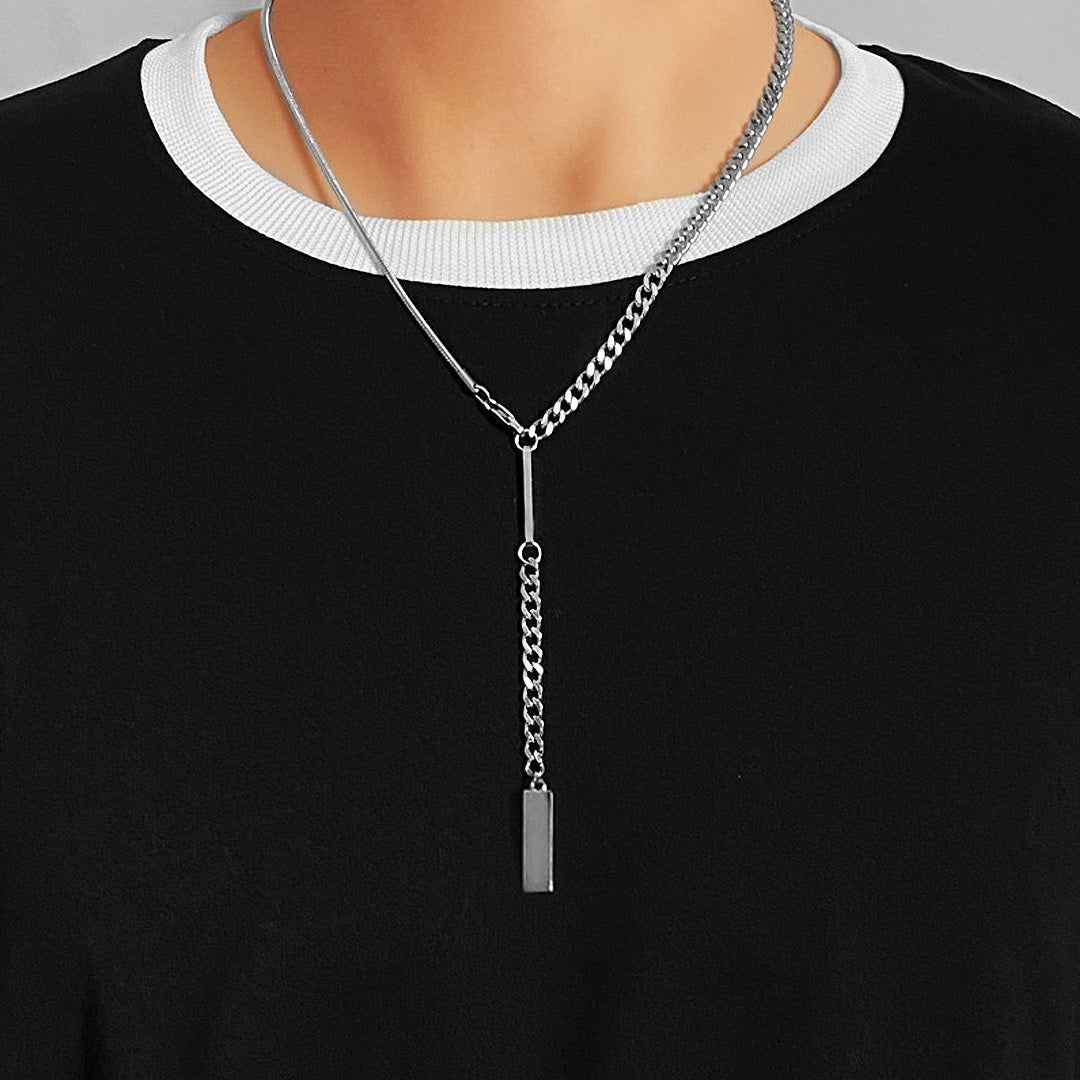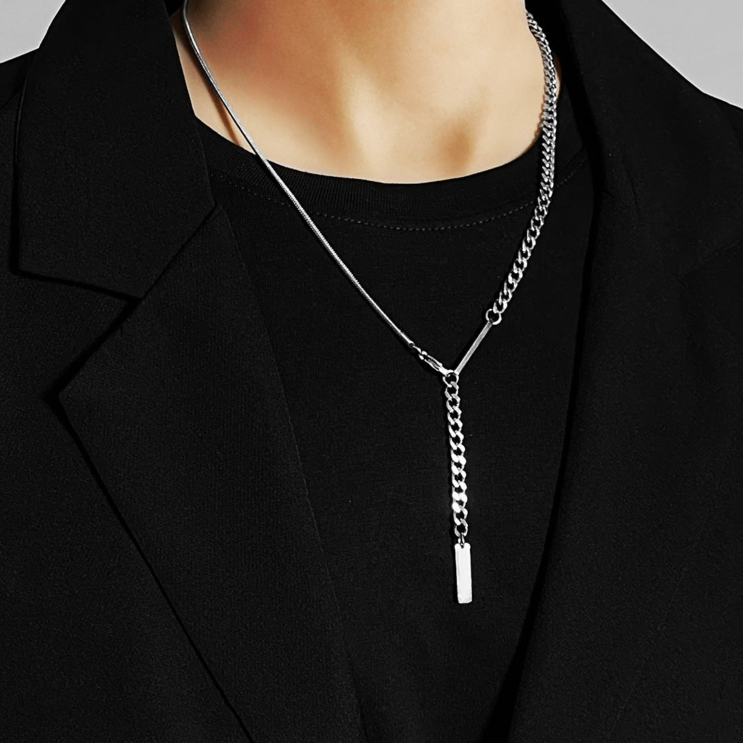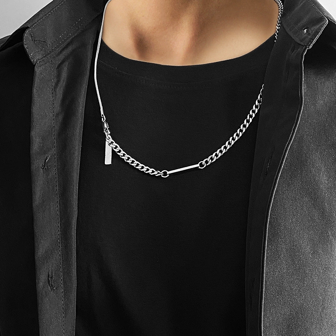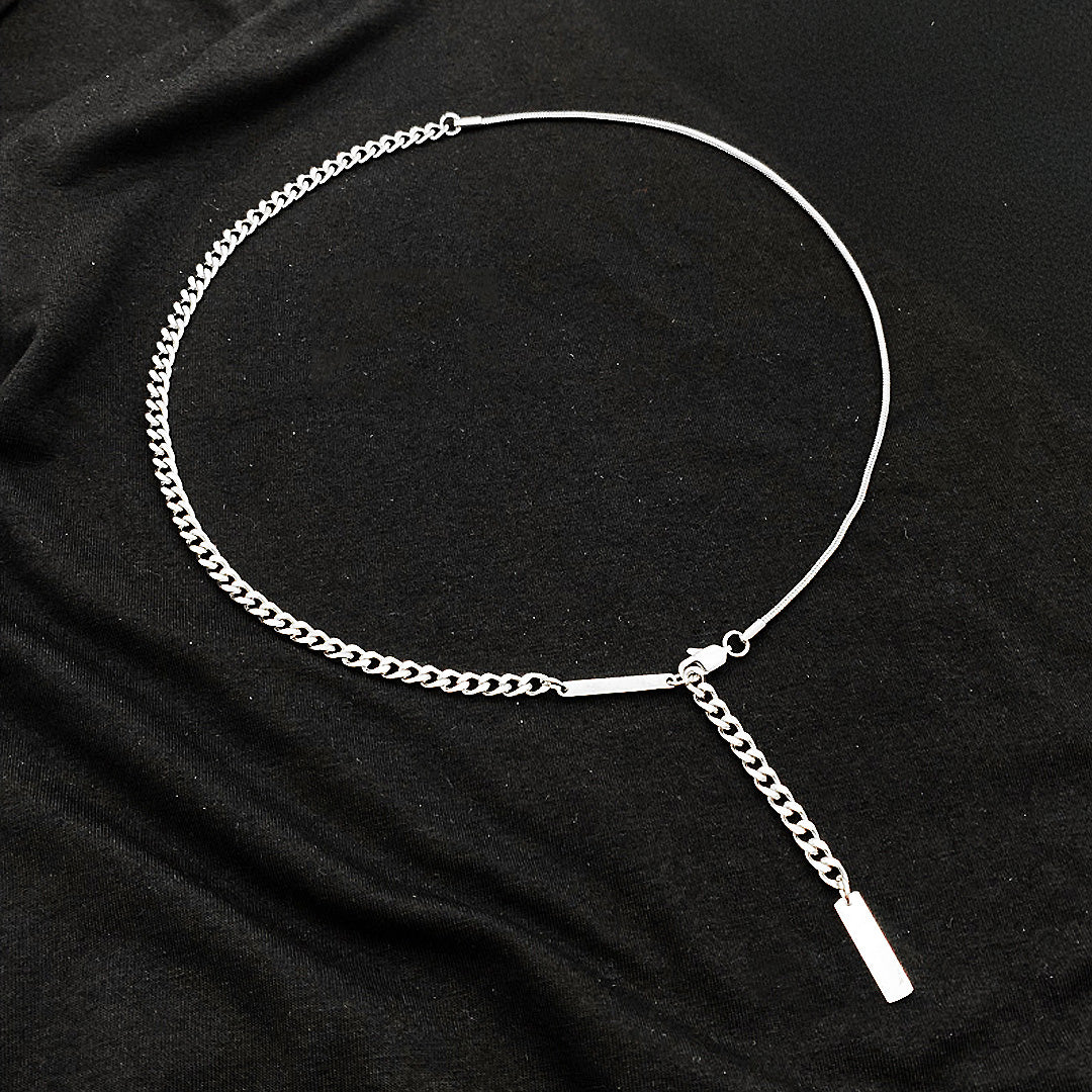 Modern and fashion-forward, the MN1064 Dual-Link Drop Luxe Necklace combines two distinct chain styles into one striking design. One side features a sleek snake chain, while the other is crafted with bold curb links, meeting in a vertical drop accent finished with a minimalist titanium steel bar. The result is a versatile necklace that’s both edgy and sophisticated, perfect for layering or making a solo statement.