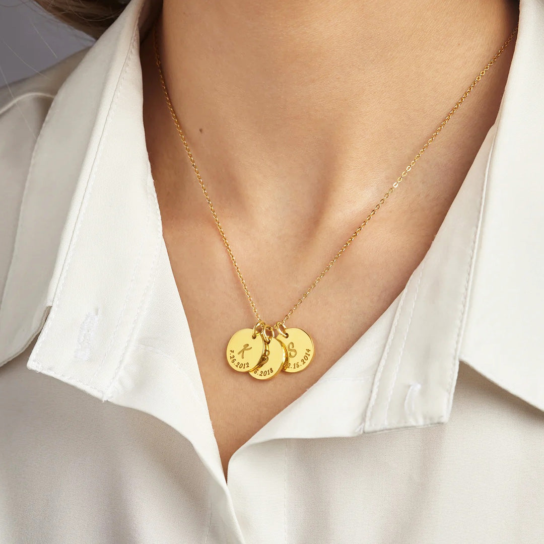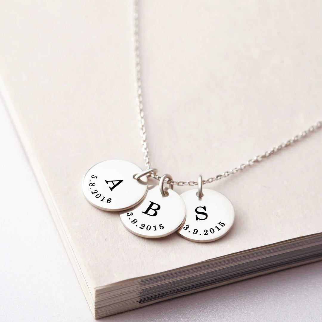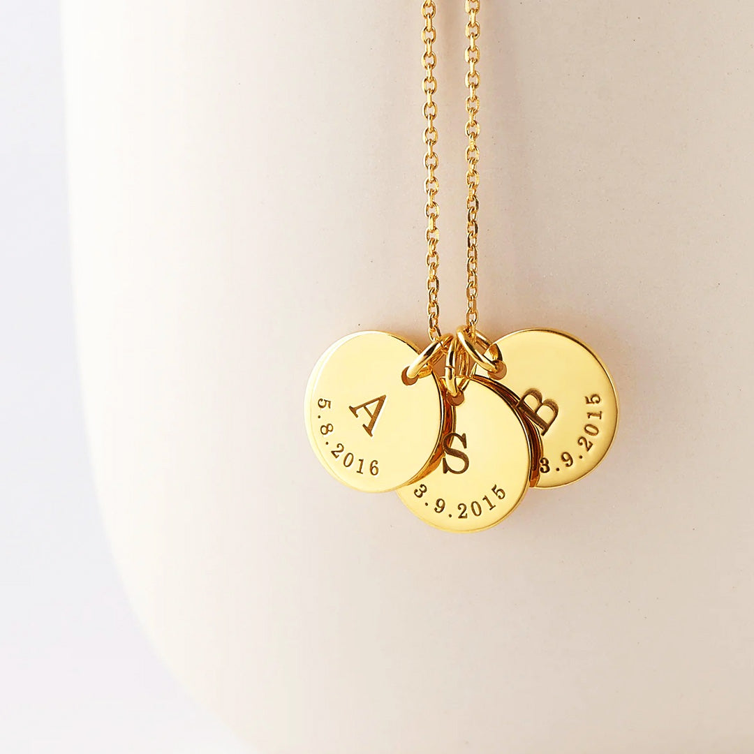 The Nova - 1018 features one or more circular disc pendants, each one meticulously engraved with an initial, a special date, or a meaningful symbol. You can mix and match to represent each member of your family, your children's birth dates, or a combination of initials and important anniversaries.
