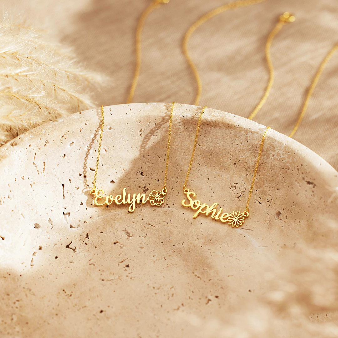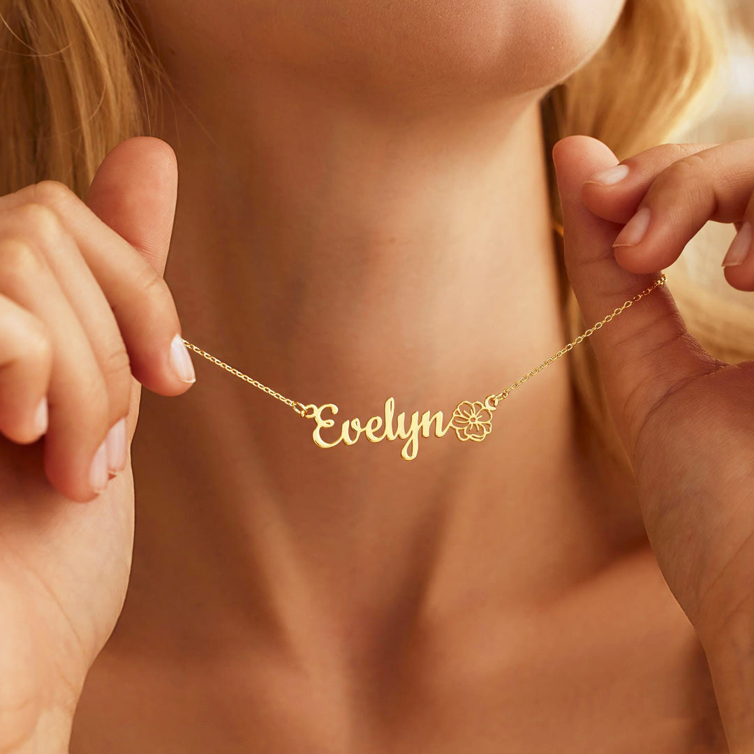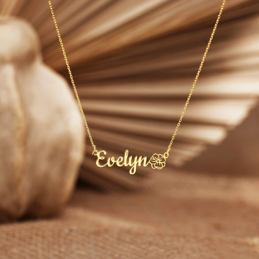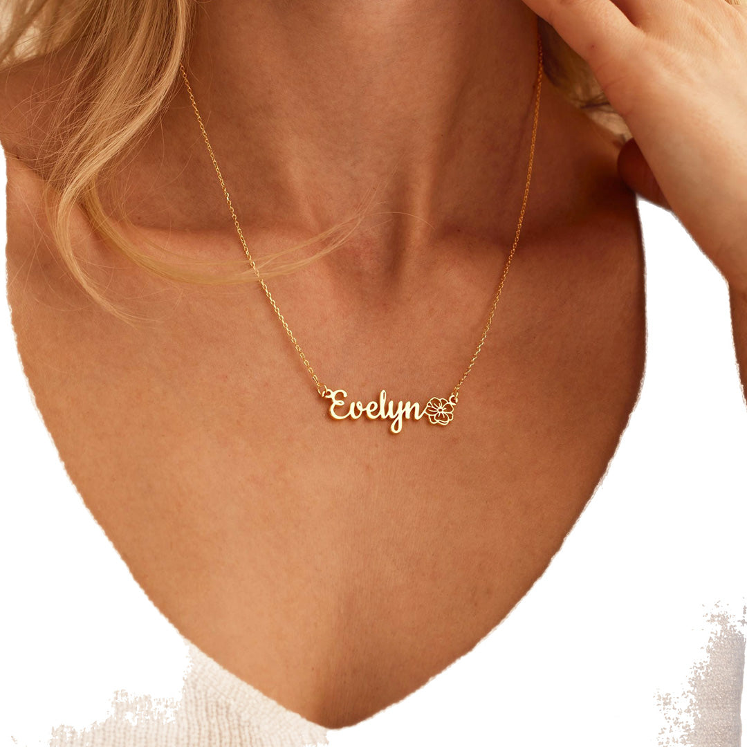 Celebrate yourself or a loved one with the enchanting Nova - 1019 Birth Flower & Name Necklace. This beautiful and delicate piece combines a personal name with the unique symbol of a birth flower, creating a meaningful accessory that is as individual as you are.