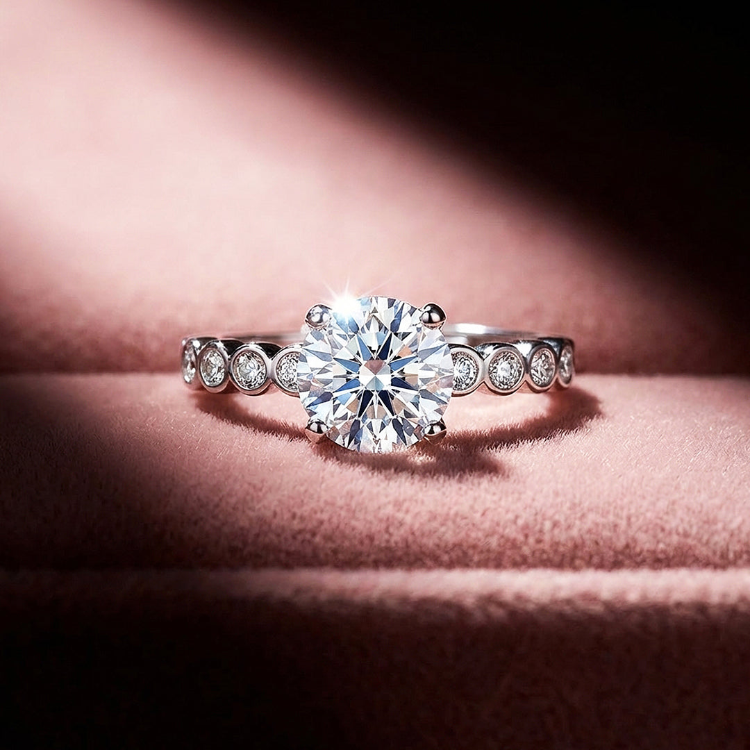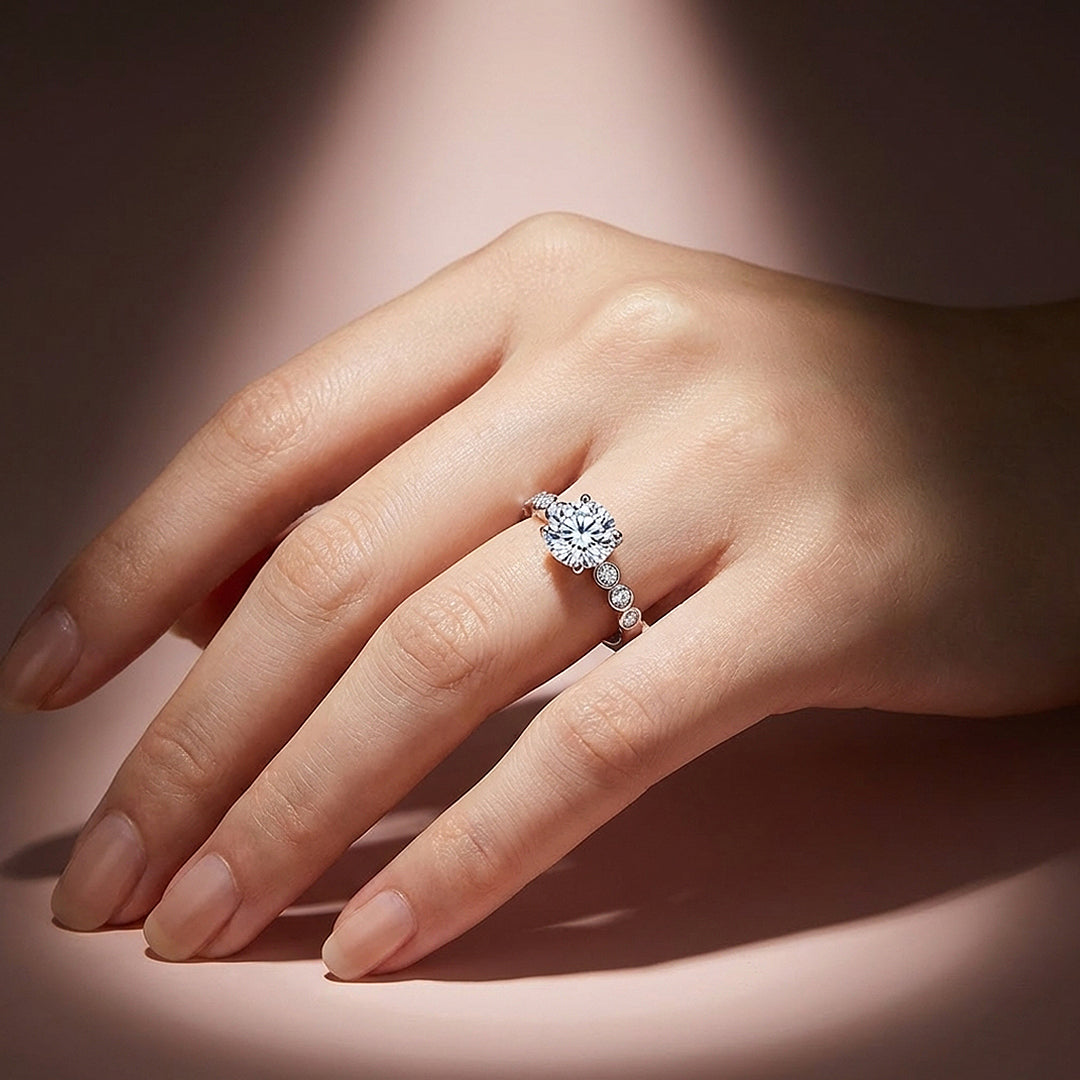 The Luxe2011 earns its second look from the band. A 1-carat round brilliant diamond simulant sits in a classic six-claw setting above shoulders lined with individually bezel-set station stones — a detail borrowed from art deco jewellery tradition, where the enclosed metal rim around each stone creates a rhythm of light that draws the eye along the finger rather than just upward. Clean, architectural, and quietly distinctive. The ring that rewards the people who notice the details — and there will always be someone who does.