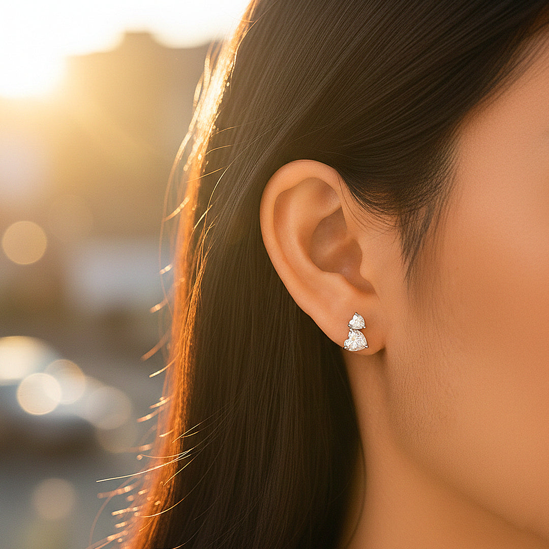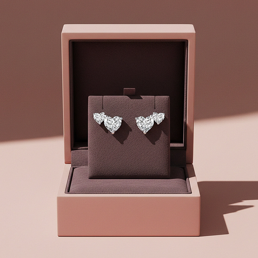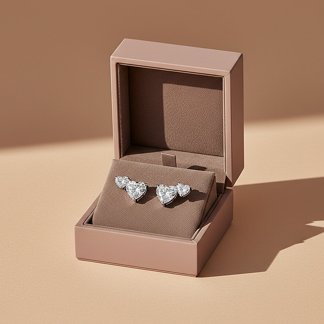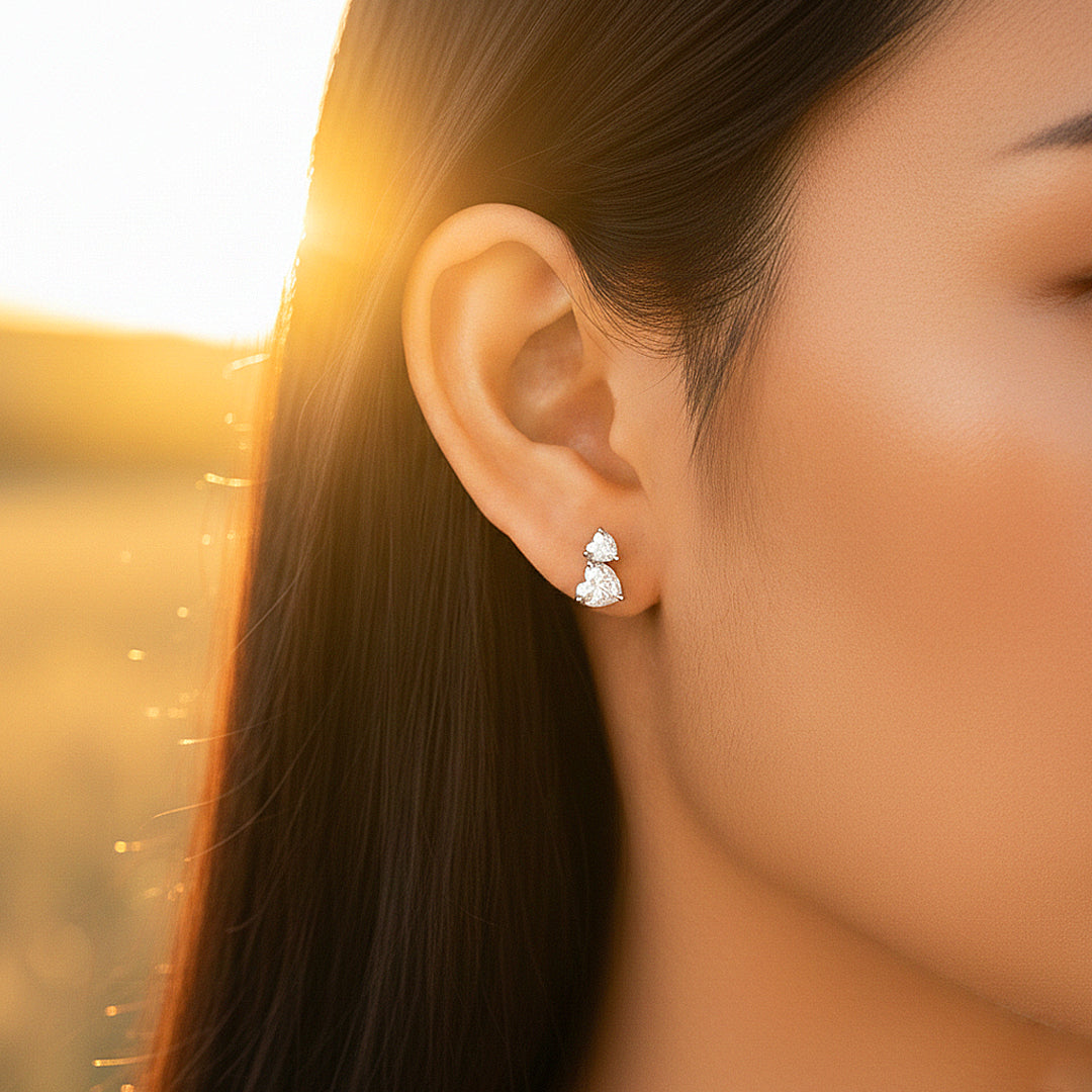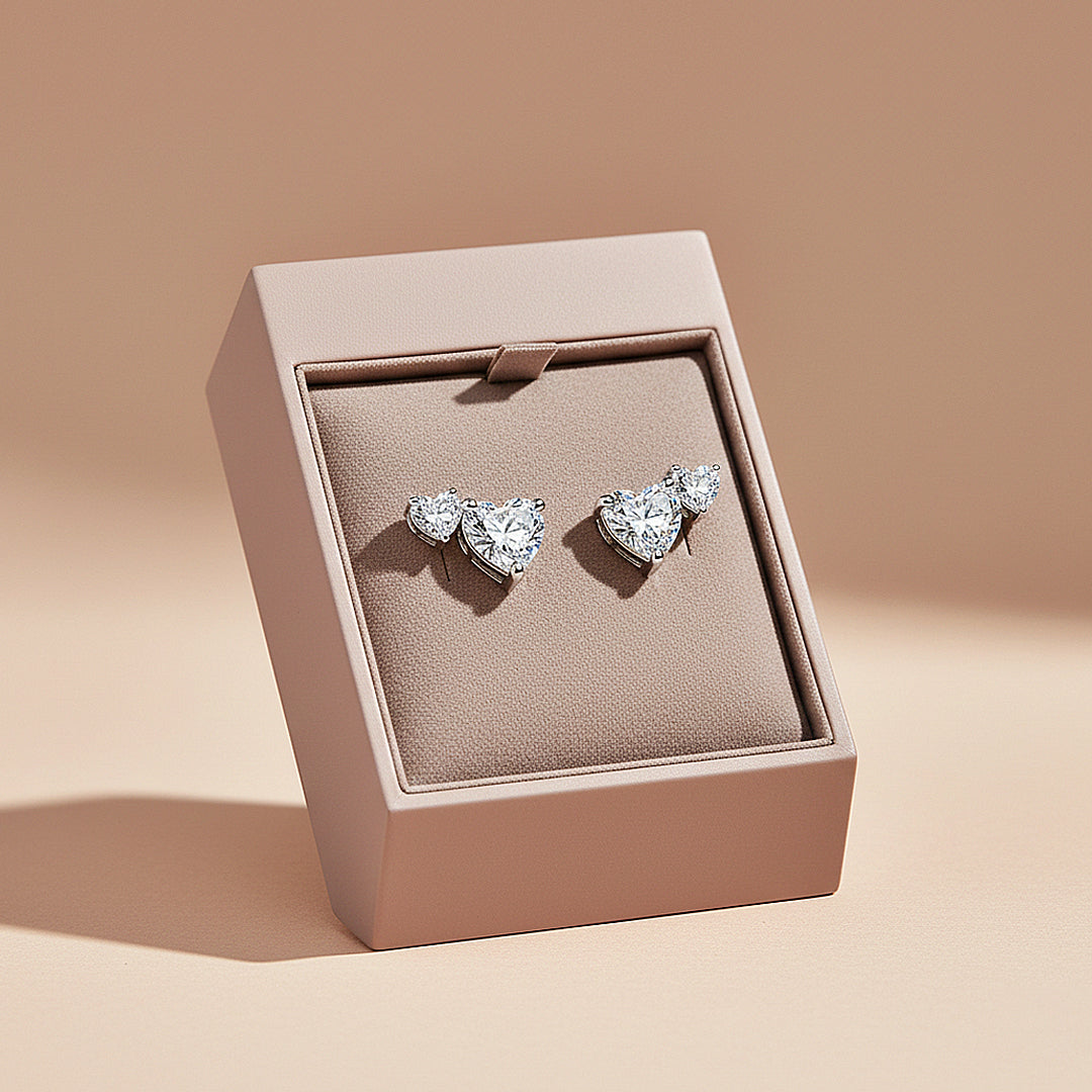 Celestial Hearts is a refined celebration of romance elevated to its most luxurious form. Each earring showcases a perfectly cut 6.5mm heart-shaped Premium D-colour, VVS1 Moissanite, paired with a delicately balanced 5.0mm heart above it. The dual-heart silhouette creates a graceful cascade that catches the light from every angle, producing an extraordinary display of diamond-like fire and scintillation. Every facet is precision-cut to maximise brilliance, resulting in a luminous sparkle that feels both captivating and undeniably prestigious.