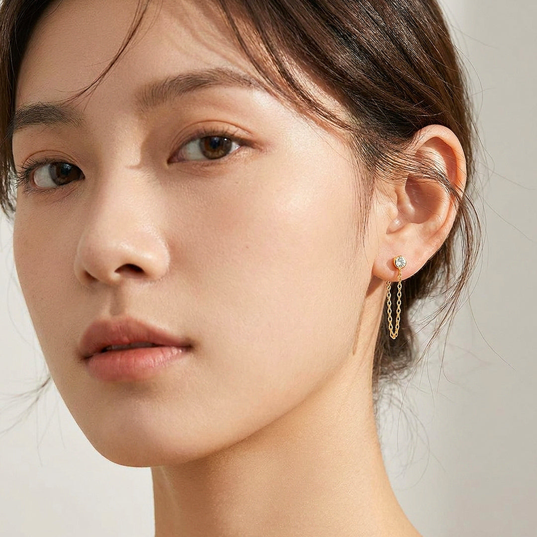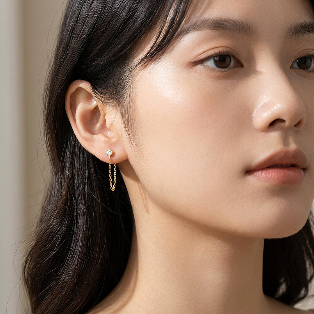 - Solitaire Stud with Chain Drop: A round gemstone stud anchors the design at the lobe, with a delicate double-link chain falling gracefully below for subtle, refined movement.
