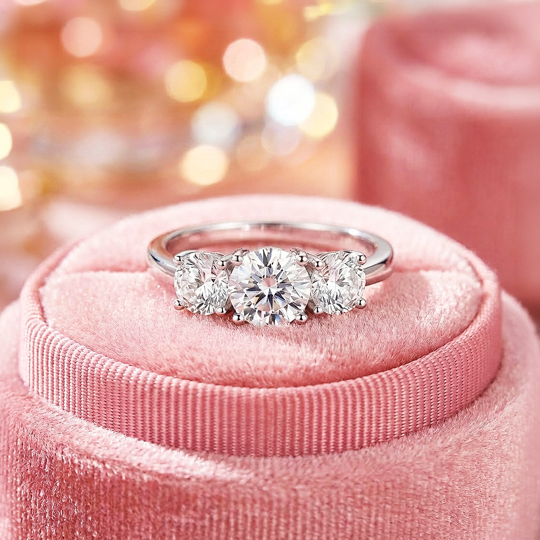 Designed for those who appreciate both symbolism and presence, this moissanite ring showcases exceptional fire and clarity across all stones. Known for its superior brilliance and durability, moissanite reflects light with remarkable intensity, offering a diamond-like sparkle that remains vivid over time. Available in 2 carat or 4 carat total weight, it allows you to choose the level of presence that best reflects your moment — whether subtle or striking.