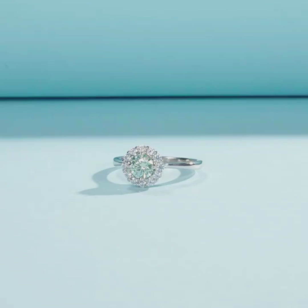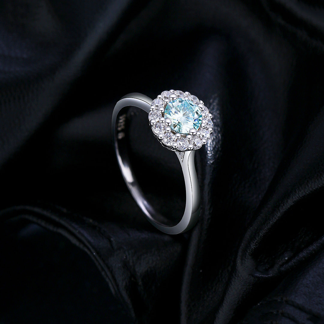 Main Stone: 0.5 Carat Moissanite, surrounded by a halo of dazzling brilliance