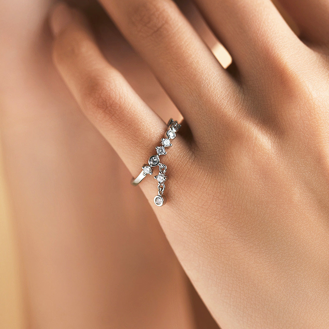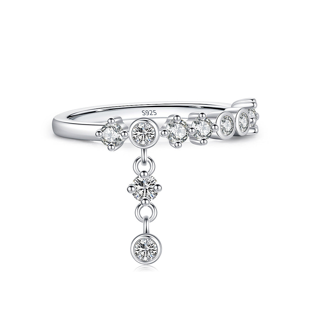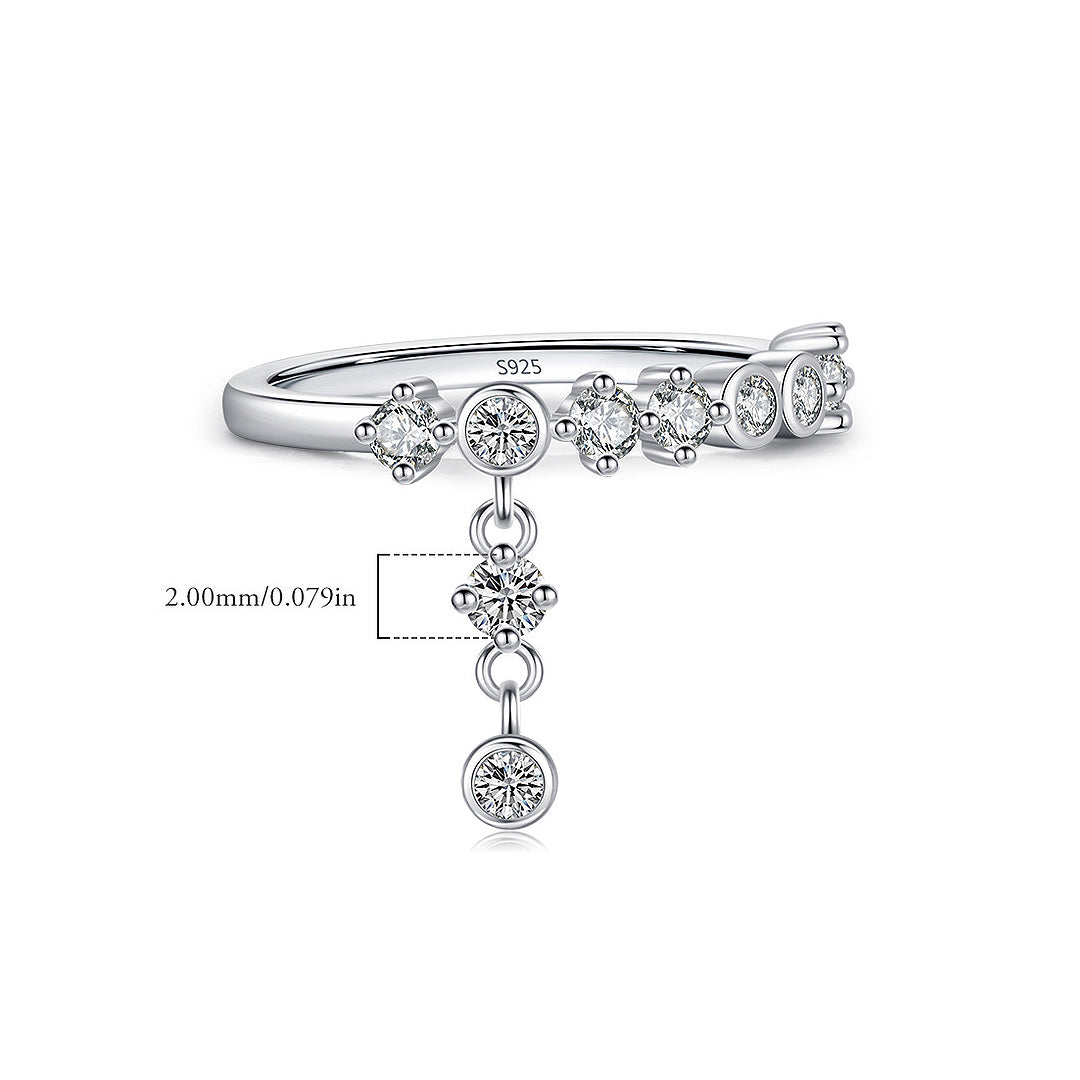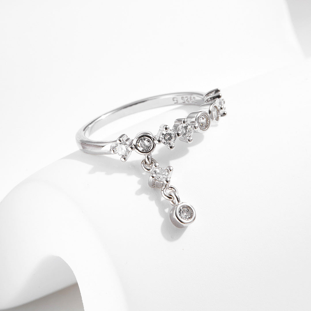The Glimmer Ring – Prm7108 is designed to capture light and admiration with every movement. Expertly crafted in 925 sterling silver, this elegant piece showcases a graceful arrangement of top-grade AAAAA cubic zirconia, each stone precision-cut for maximum brilliance. The delicate cascade design features a row of sparkling stones with a dangling centerpiece, creating a radiant shimmer that moves gracefully with you.