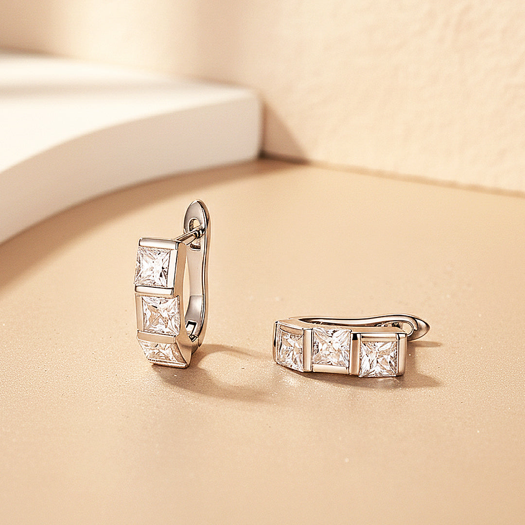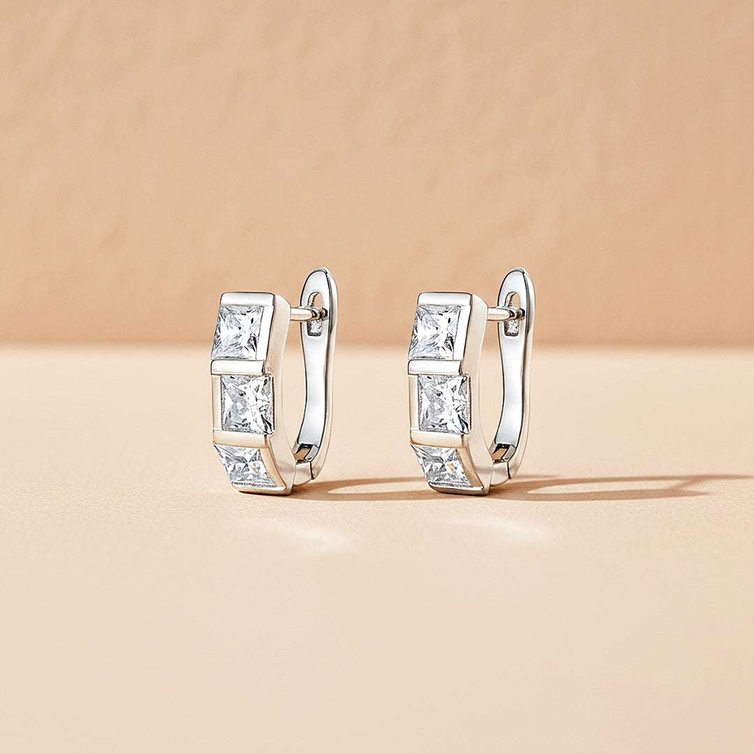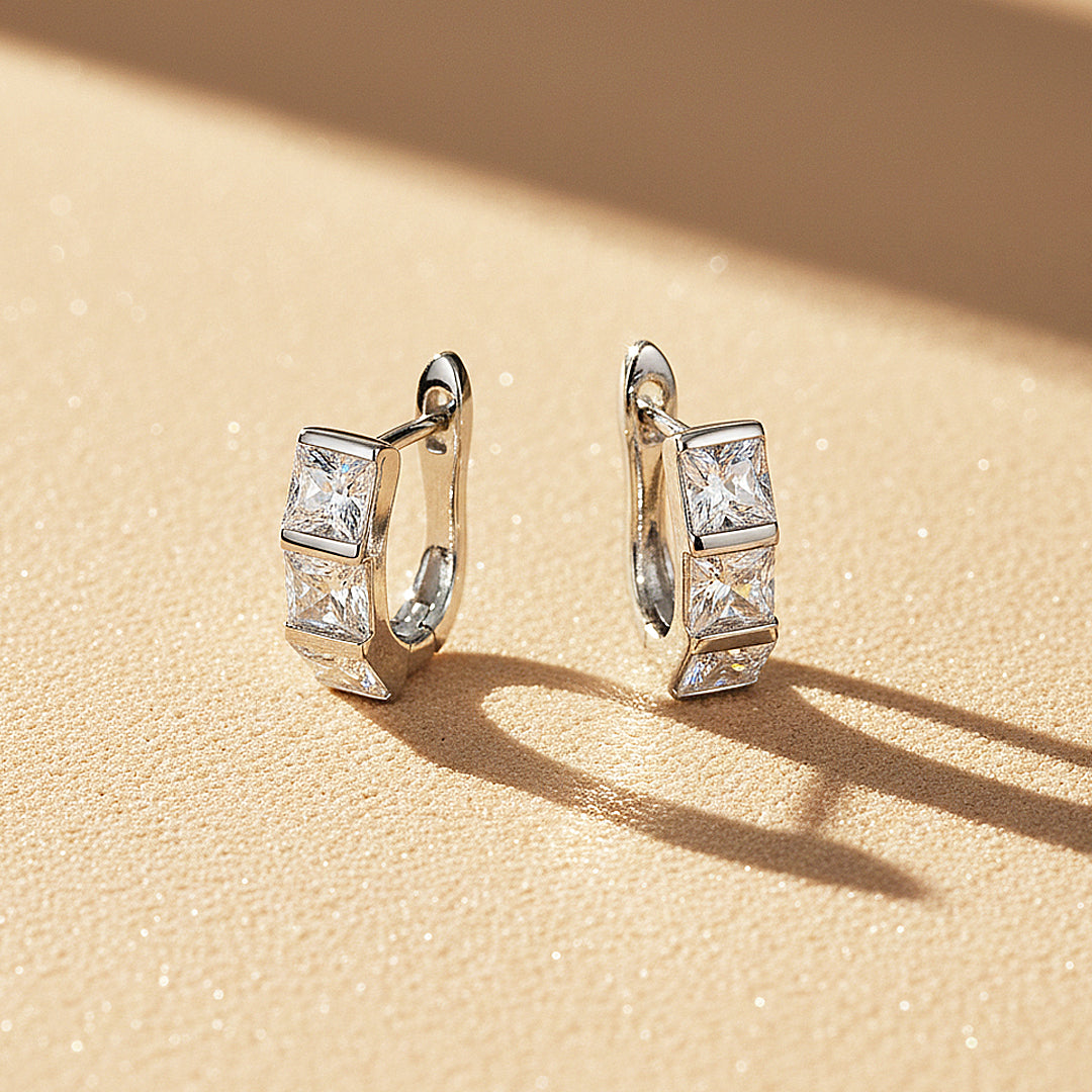 Sovereign Prism is a study in precision, power, and polished refinement. Each hoop is meticulously set with perfectly aligned princess-cut Premium Moissanite stones, creating a seamless row of sharp, mirror-like facets that radiate intense, diamond-like fire. The clean geometric silhouette exudes modern authority, while the D-colour VVS1 clarity ensures uncompromising brilliance with every movement.