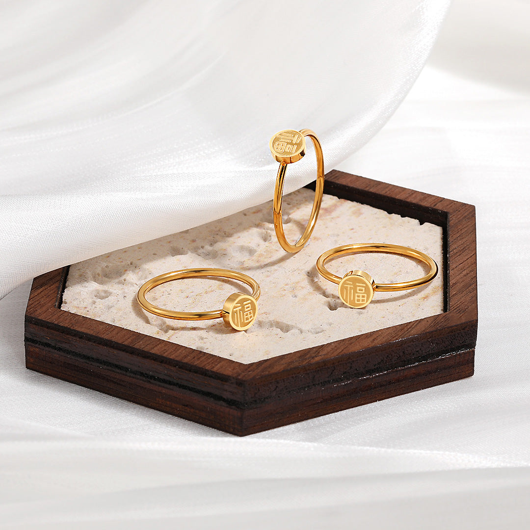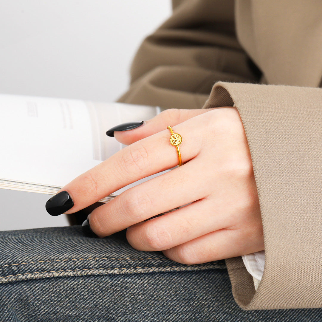 Embodying tradition with a touch of modern minimalism, the Luxe5128 Ring is a meaningful piece designed to bring elegance and positivity to your everyday wear. The circular charm is beautifully engraved with an auspicious motif, symbolizing good fortune and blessings, making it more than just a ring – it’s a talisman of prosperity.