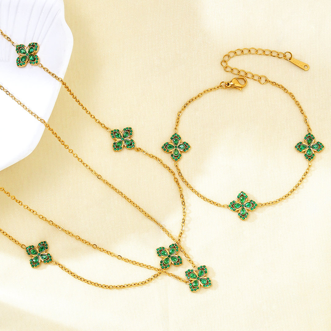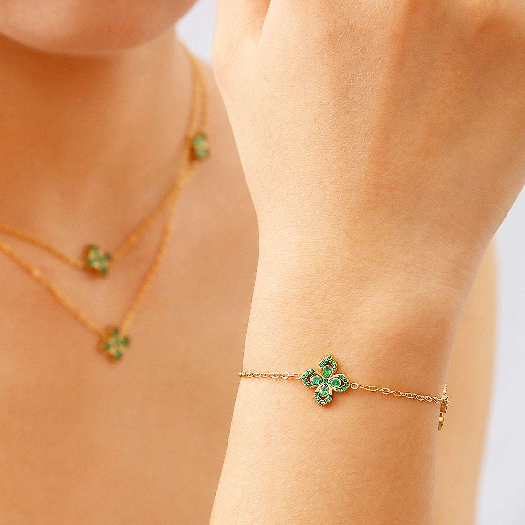 Adorn yourself with the captivating luck and regal color of the Luxe4428 Golden Emerald Clover Set. This exquisite matching necklace and bracelet instantly elevate your style with a continuous pattern of delicate, jewel-toned clover stations. Each four-leaf motif is meticulously crafted and entirely paved with vibrant emerald-hued Simulant Diamonds, which deliver an intense, concentrated sparkle that mimics the fire of a precious gemstone. The entire set is bathed in a luminous, rich Gold Plating, applied via a robust five-layer electroplating process that ensures spectacular, lasting color. The necklace features a chic double-strand design, layering the charms beautifully along the neckline.
