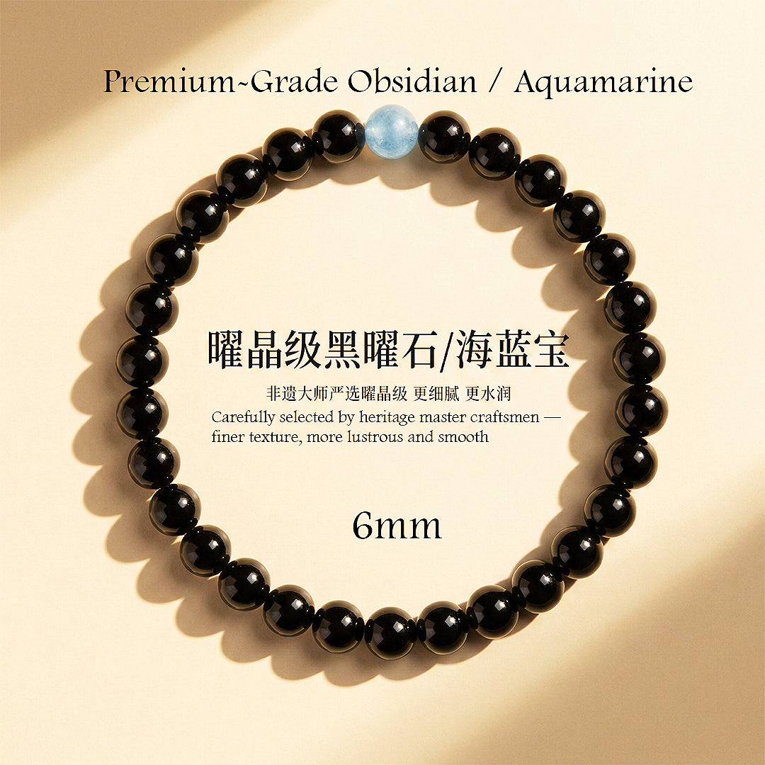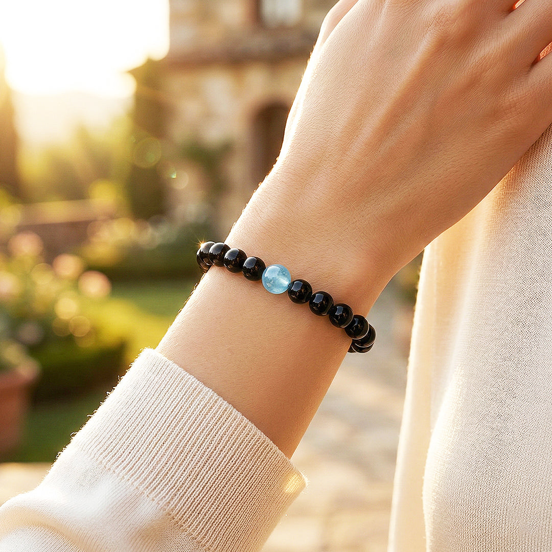Introducing the C260 – Calm Protector, a refined crystal bracelet designed to harmonise strength and serenity. Deep, glossy Obsidian beads form a bold foundation, radiating grounded protection and quiet confidence. At its centre, a luminous Aquamarine stone glows with tranquil oceanic hues, symbolising clarity, emotional balance, and calm communication. The contrast between midnight black and serene blue creates a sophisticated statement — powerful yet composed, protective yet graceful.