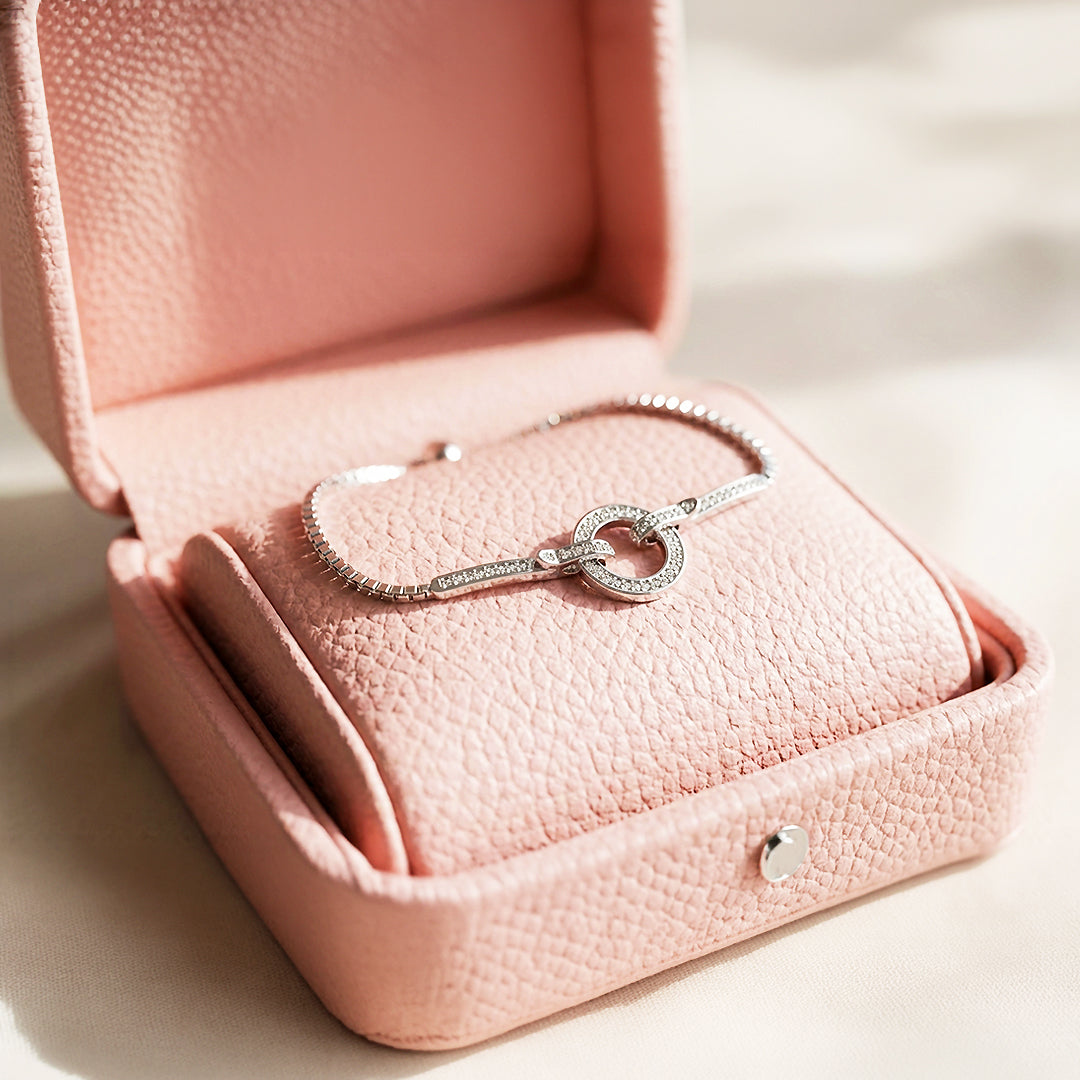 Elevate your jewelry collection with this striking geometric bolo bracelet, a fusion of contemporary structure and timeless radiance. The focal point features a captivating interlocking silhouette—a shimmering pavé-set halo merged with sleek, high-polish bars for a sophisticated architectural look. Anchored by a delicate box chain and a smooth adjustable slider, this piece creates a multi-dimensional glow that catches the light from every angle. It is the definitive expression of modern luxury, crafted for those who balance a bold presence with feminine grace.