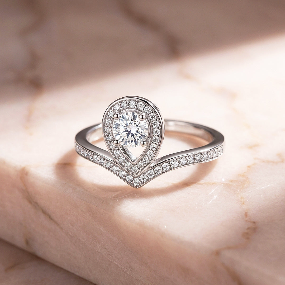 An elegant interplay of shape and light, this teardrop halo ring features a refined crown-inspired silhouette that gently frames a brilliant round centre stone. The graceful open teardrop design adds a modern, airy touch, while the pavé-set details enhance its radiance with a soft, continuous shimmer.