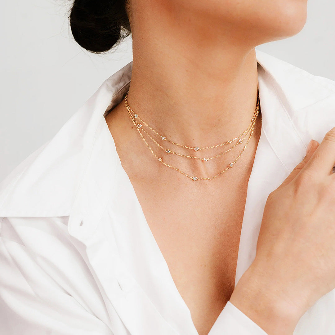 Delicate, dazzling, and designed for the modern woman, the Luxe4403 Three Layer Necklace adds instant sophistication to any look. Featuring three fine chains adorned with shimmering crystal accents, each layer is perfectly spaced to create a graceful cascading effect that flatters the neckline.