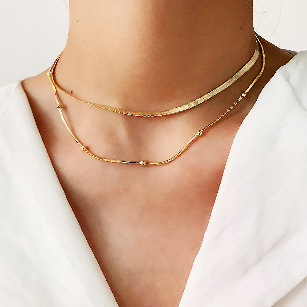 Stylish two-layer design combining a herringbone chain and bead-accent chain