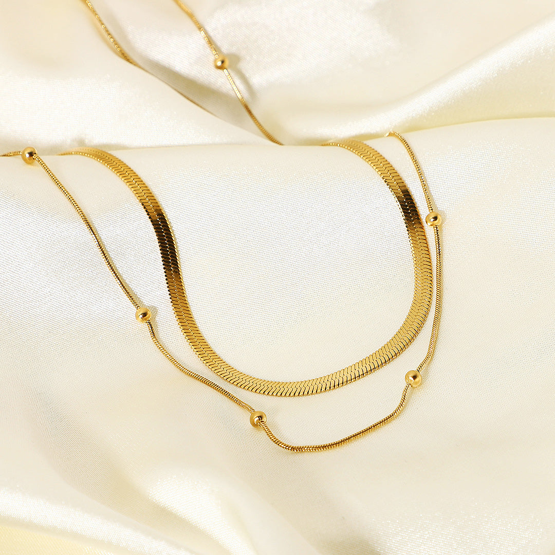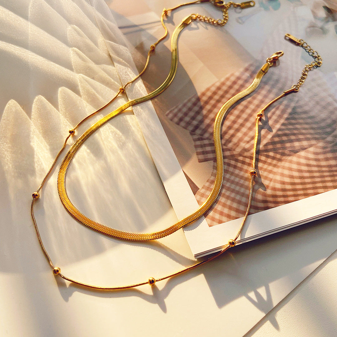 Elevate your style with the Luxe4404 Two Layer Necklace – a modern yet timeless piece designed to add instant sophistication to any outfit. Featuring a sleek herringbone chain paired with a delicate bead-accent chain, this necklace brings effortless layering in one elegant design. Made from premium stainless steel with a luxurious 18K gold-plated finish, it offers lasting shine without tarnishing, while being gentle on sensitive skin. Perfect for both casual days and special occasions, this piece will become your go-to for a polished, chic look.