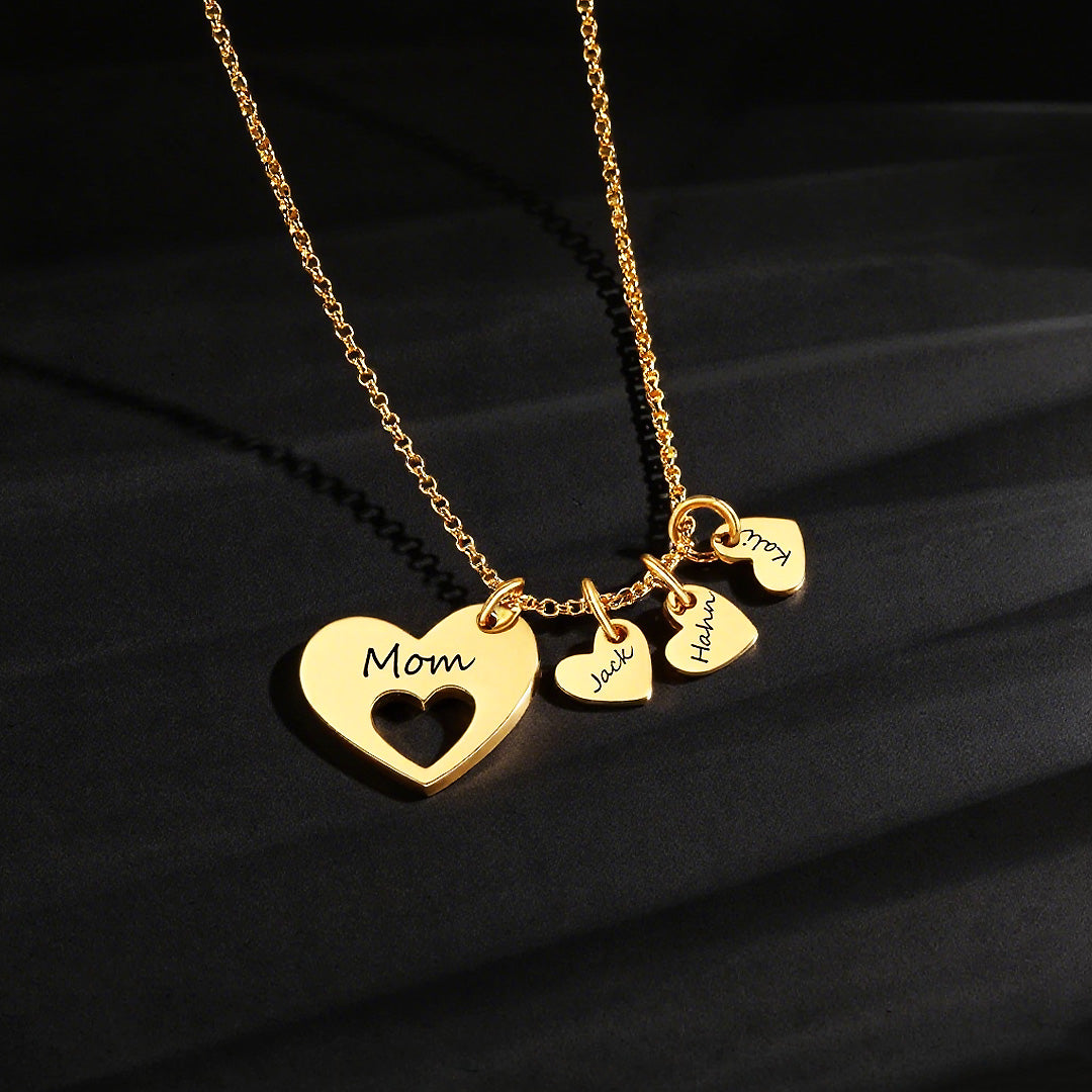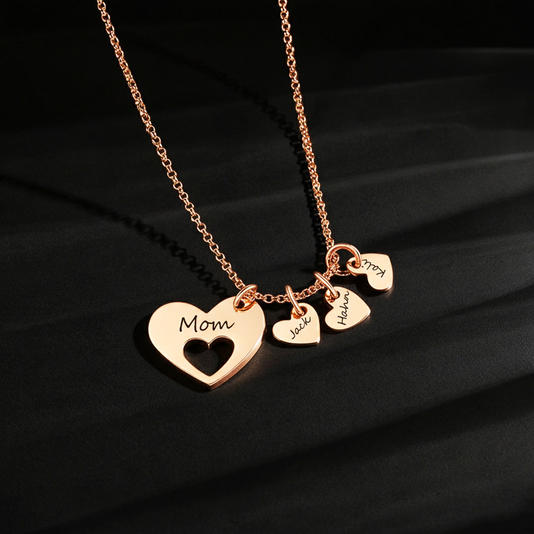 Celebrate love, family, and treasured bonds with the Nova - 1009 Necklace — a heartfelt keepsake designed to keep your loved ones close. Featuring a large heart pendant with a cut-out center, paired with up to 6 smaller customizable heart charms, this necklace is the perfect symbol of connection and devotion.