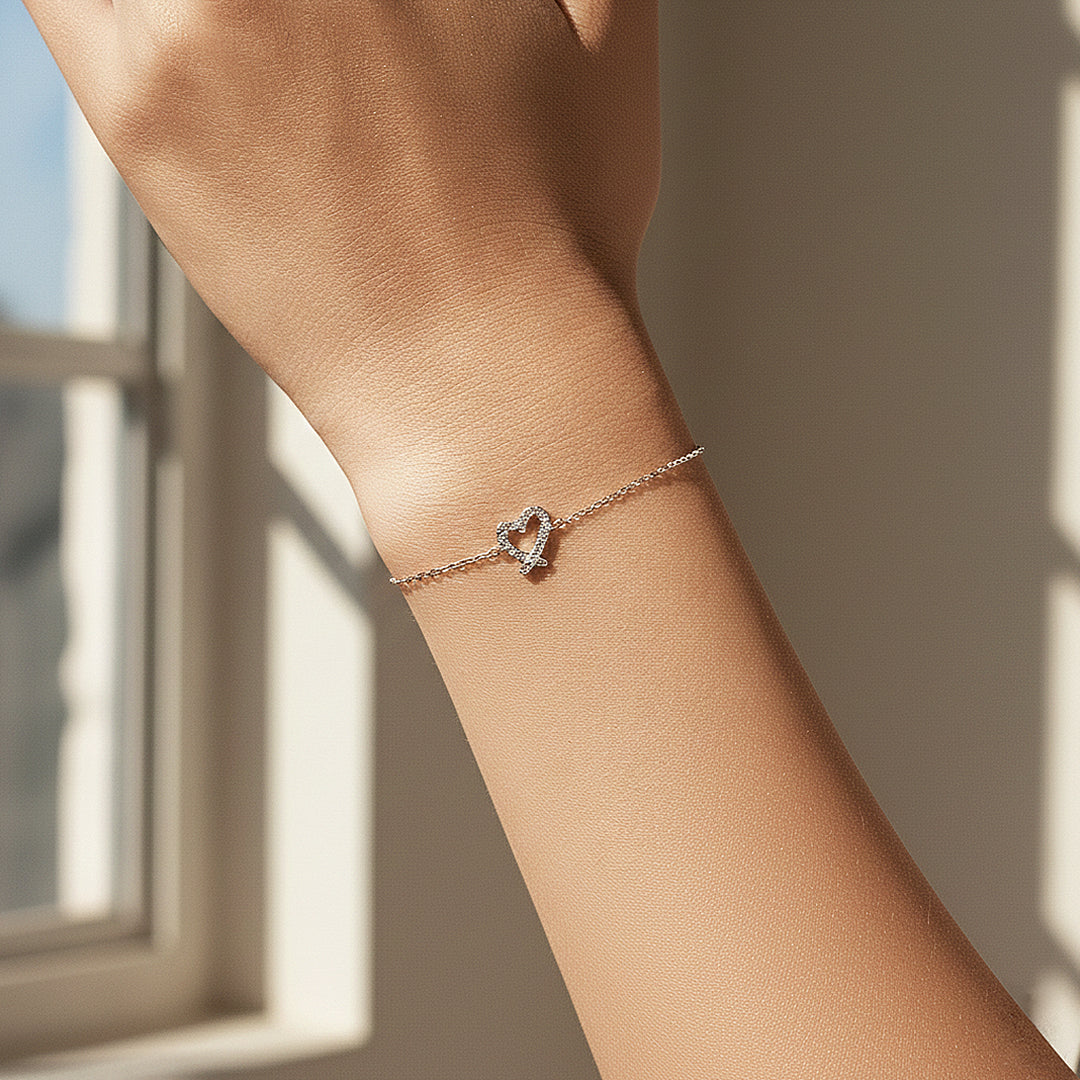Prm9147 – Velvet Glow is a refined expression of modern romance. At its centre rests a polished heart silhouette, delicately accented with a brilliant 0.015 carat D Colour, VVS1 moissanite stone that captures and reflects light with captivating fire. The sleek mirror-finish surface contrasts beautifully with the scintillating gemstone, creating a subtle yet striking sparkle that feels effortlessly elegant on the wrist. Its fine chain enhances the pendant’s softness, giving the bracelet a graceful, barely-there silhouette while maintaining undeniable presence.