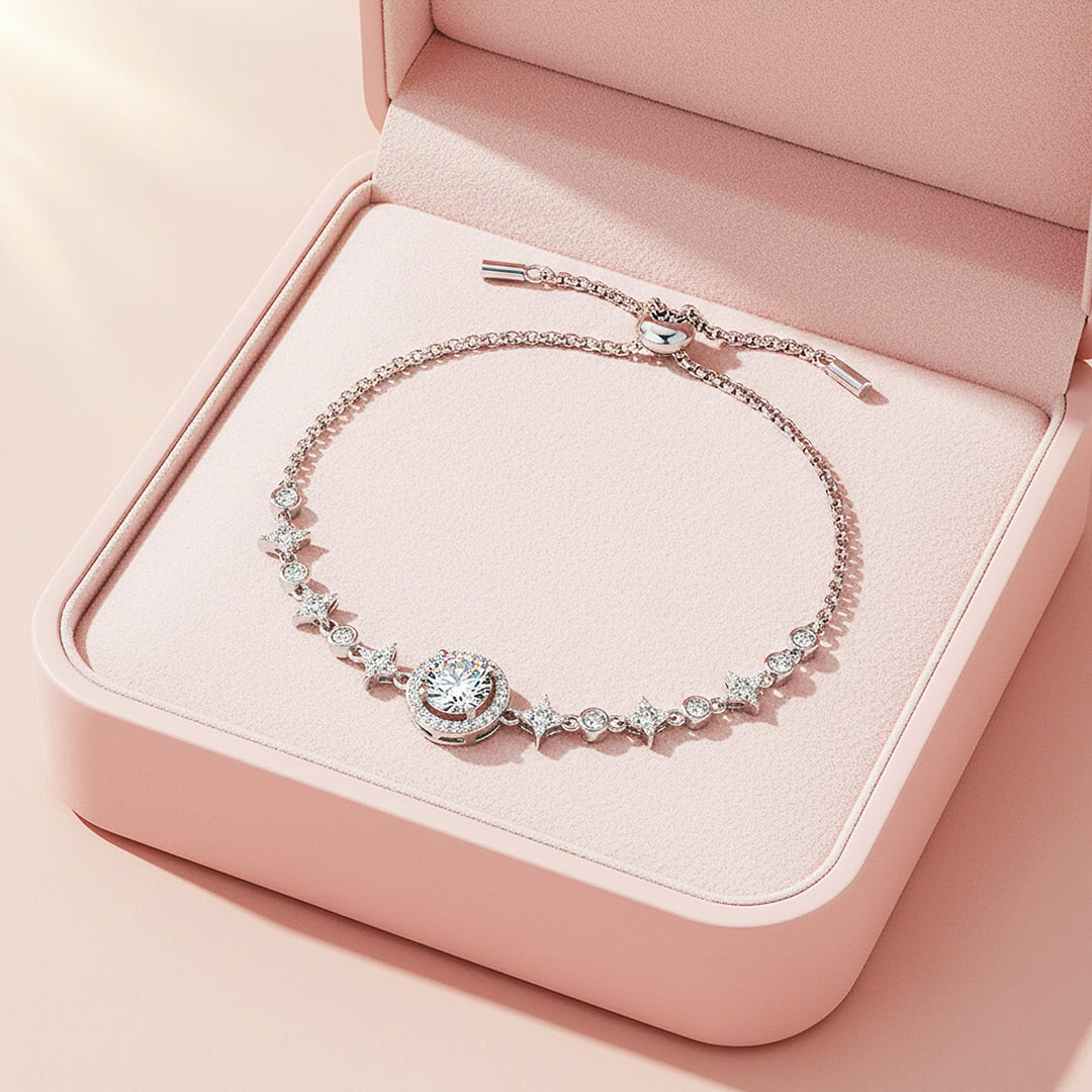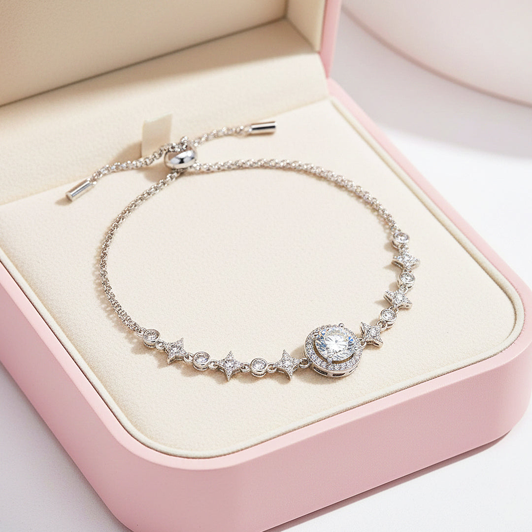 Crafted from premium 925 Sterling Silver and finished with five layers of electroplating, Starlit Halo offers a mirror-like polish with enduring durability. The adjustable sliding clasp ensures a flawless, customised fit, allowing the bracelet to sit gracefully against the wrist. Bold yet sophisticated, radiant yet refined, this piece embodies modern luxury — a captivating treasure designed to shine effortlessly from day to night.