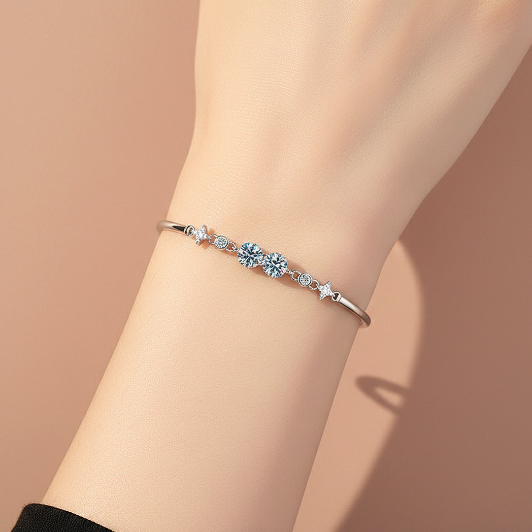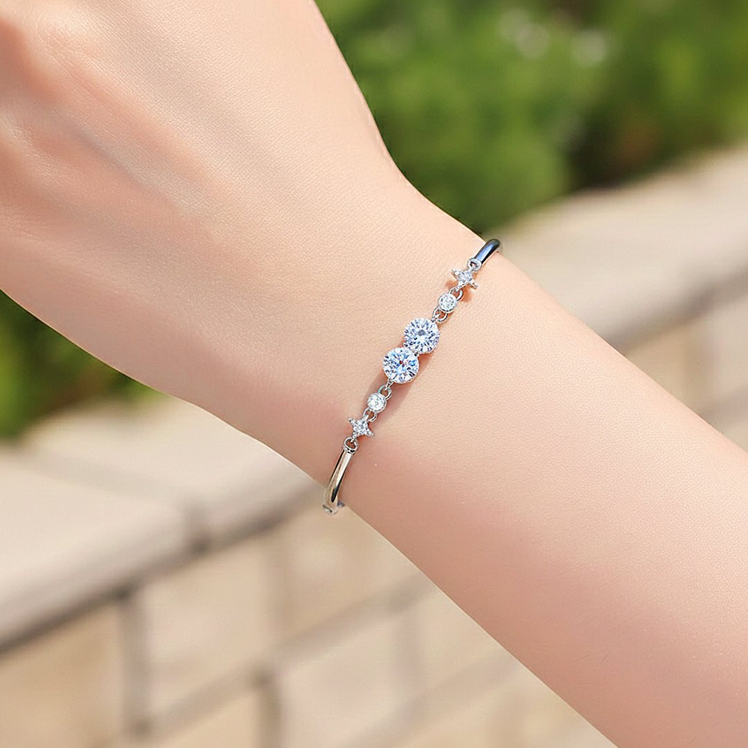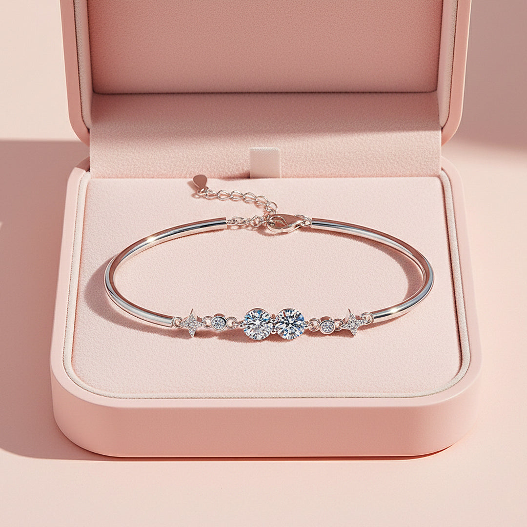 Crafted from premium 925 Sterling Silver and finished with five layers of electroplating, Twin Glow offers a luminous mirror-like shine with exceptional durability. The sleek bangle structure ensures a polished, structured look on the wrist, while the adjustable extension provides a comfortable and secure fit. Sophisticated yet youthful, this bracelet is designed for the woman who appreciates refined luxury with a fresh edge — effortlessly radiant, endlessly captivating, and made to shine in every moment.