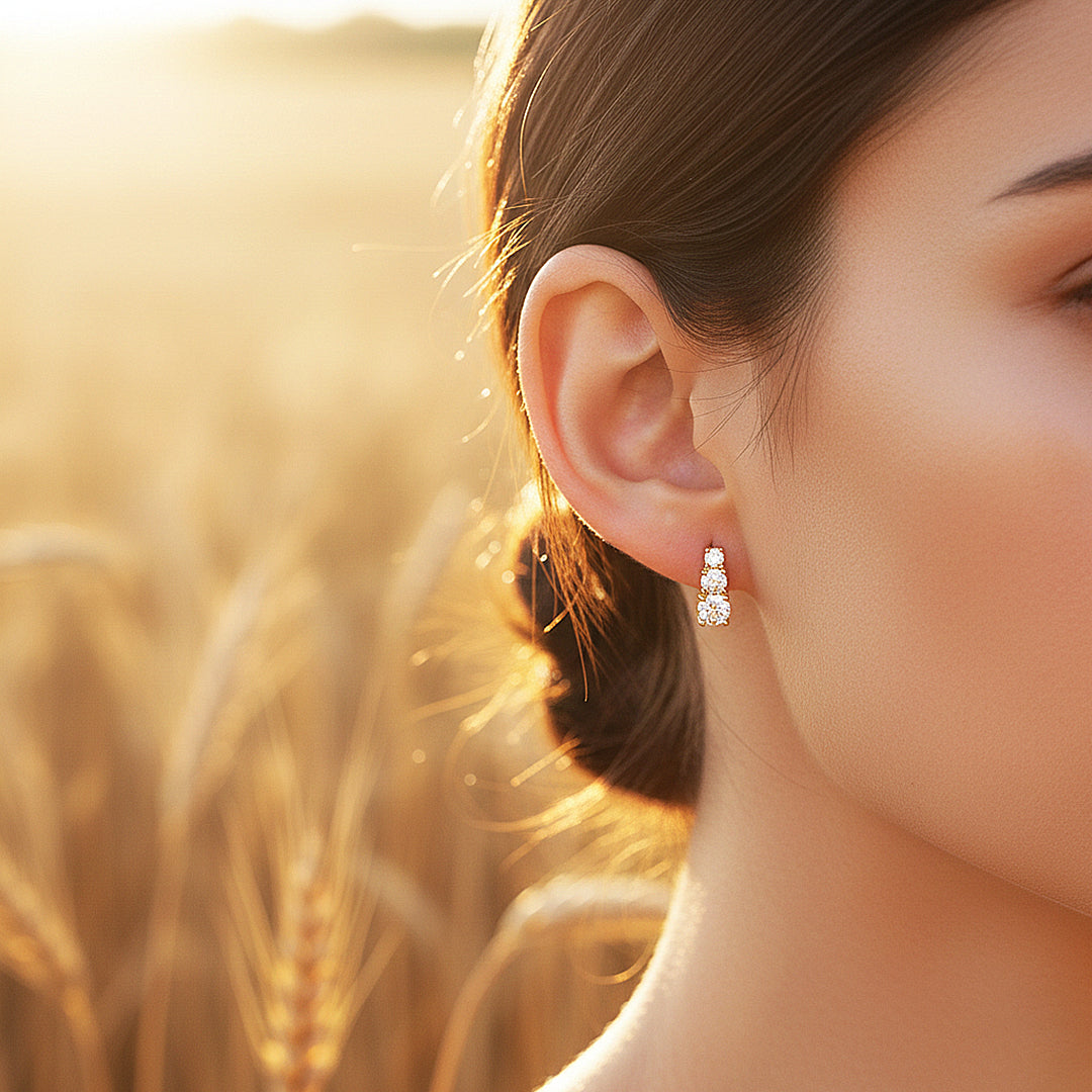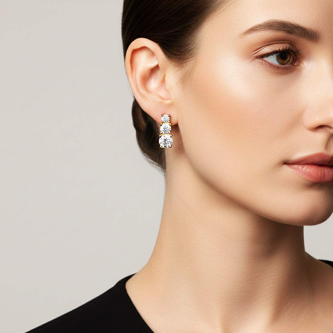 Graduated Triple Solitaire Stud Earrings | Moissanite | 14K Gold Plated 925 Sterling Silver | Prm8124