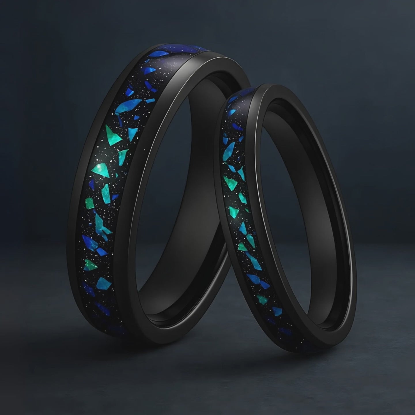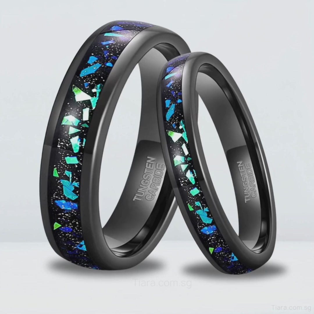 The Avatar Tungsten Ring showcases a sleek, polished black tungsten carbide exterior, providing a bold and sophisticated foundation. At its heart lies a breathtaking central inlay of vibrant blue and green opal fragments, meticulously arranged to create a dynamic and iridescent mosaic. These stunning opal chips shimmer and shift with every movement, revealing an otherworldly play of light and color that is utterly captivating. The contrast between the deep, mysterious black and the brilliant, swirling opal creates a visual experience that is truly unique and unforgettable.