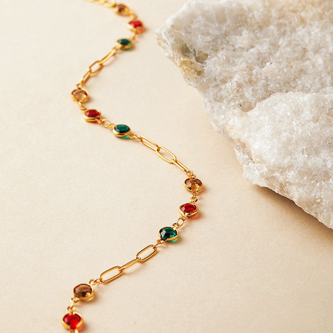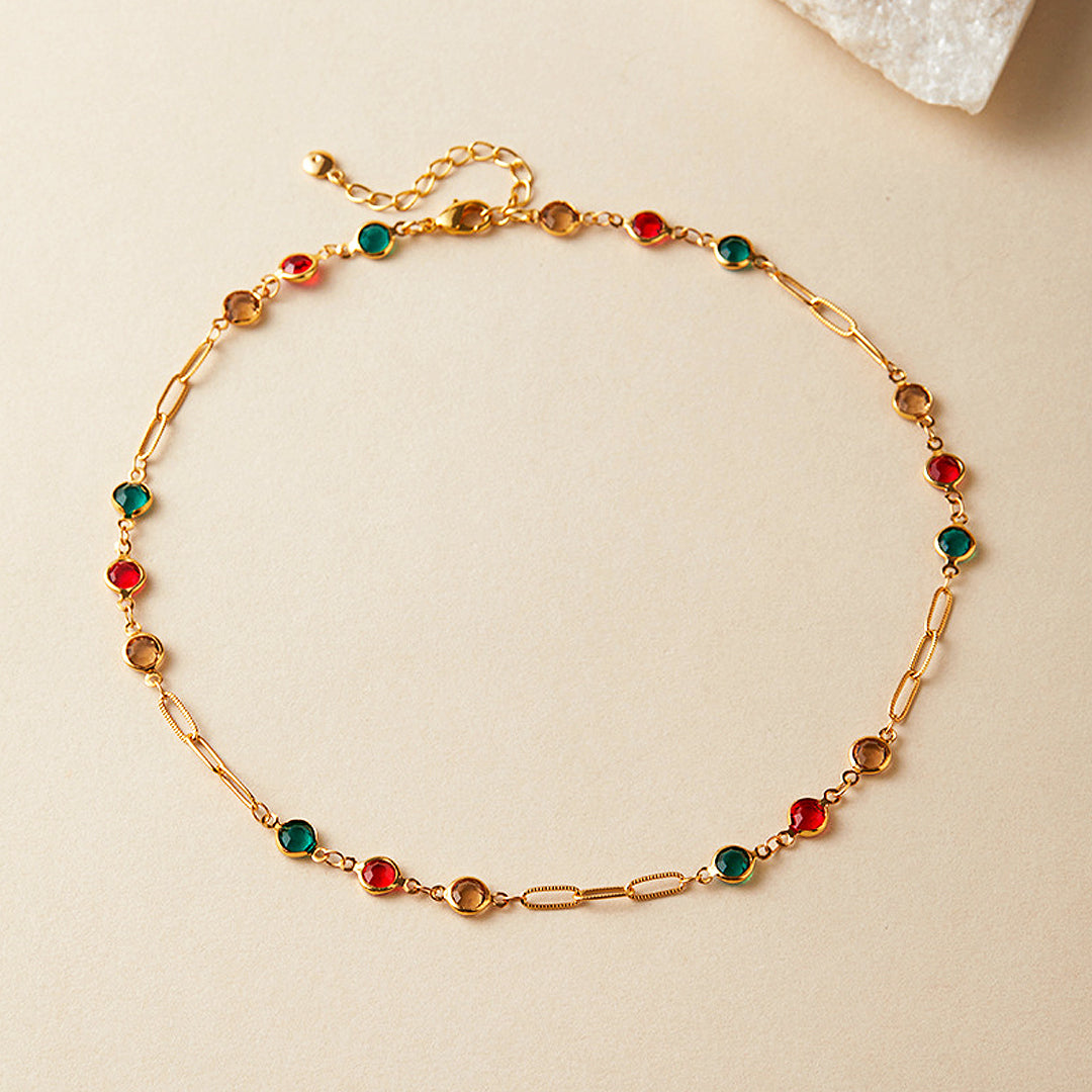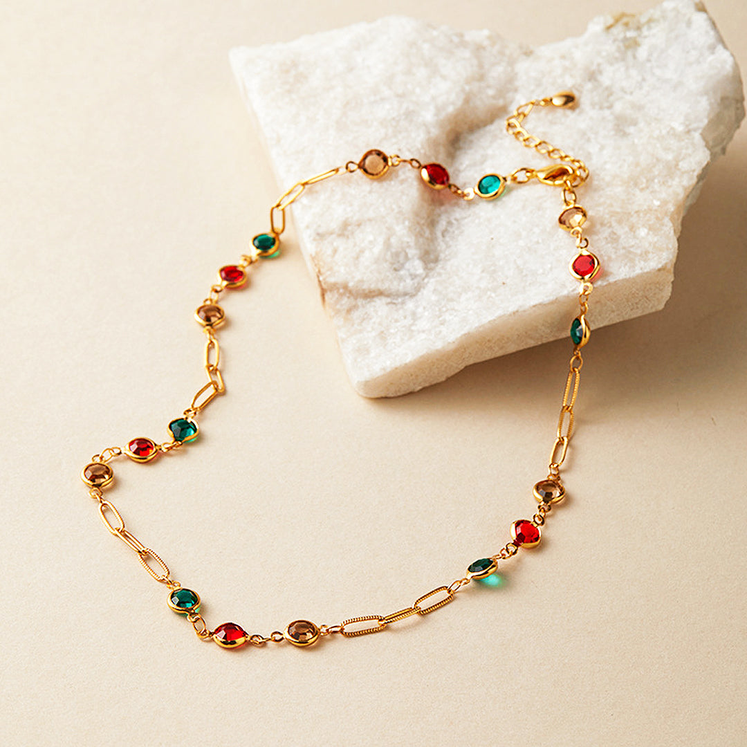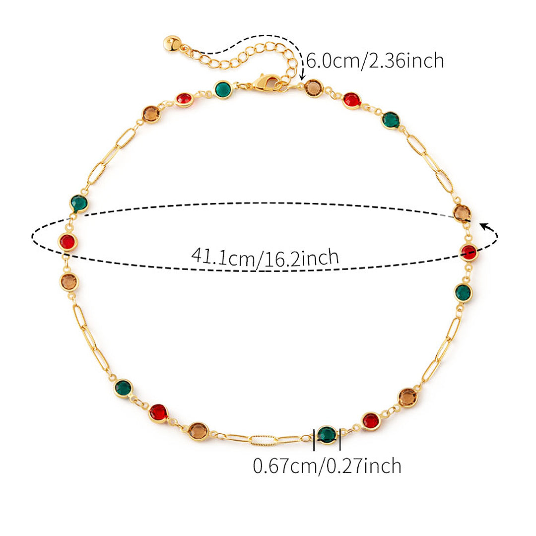 Adorn your neckline with the captivating, festive color of the Luxe4422 Multi-Gemstone Station Necklace. This striking piece creates a joyful visual feast by alternating sleek paperclip links with perfectly round, bezel-set multi-colored gemstones. The vibrant stations—in rich tones of ruby red, emerald green, and warm citrine brown—are brilliantly faceted, ensuring they catch the light with an intense, captivating sparkle.