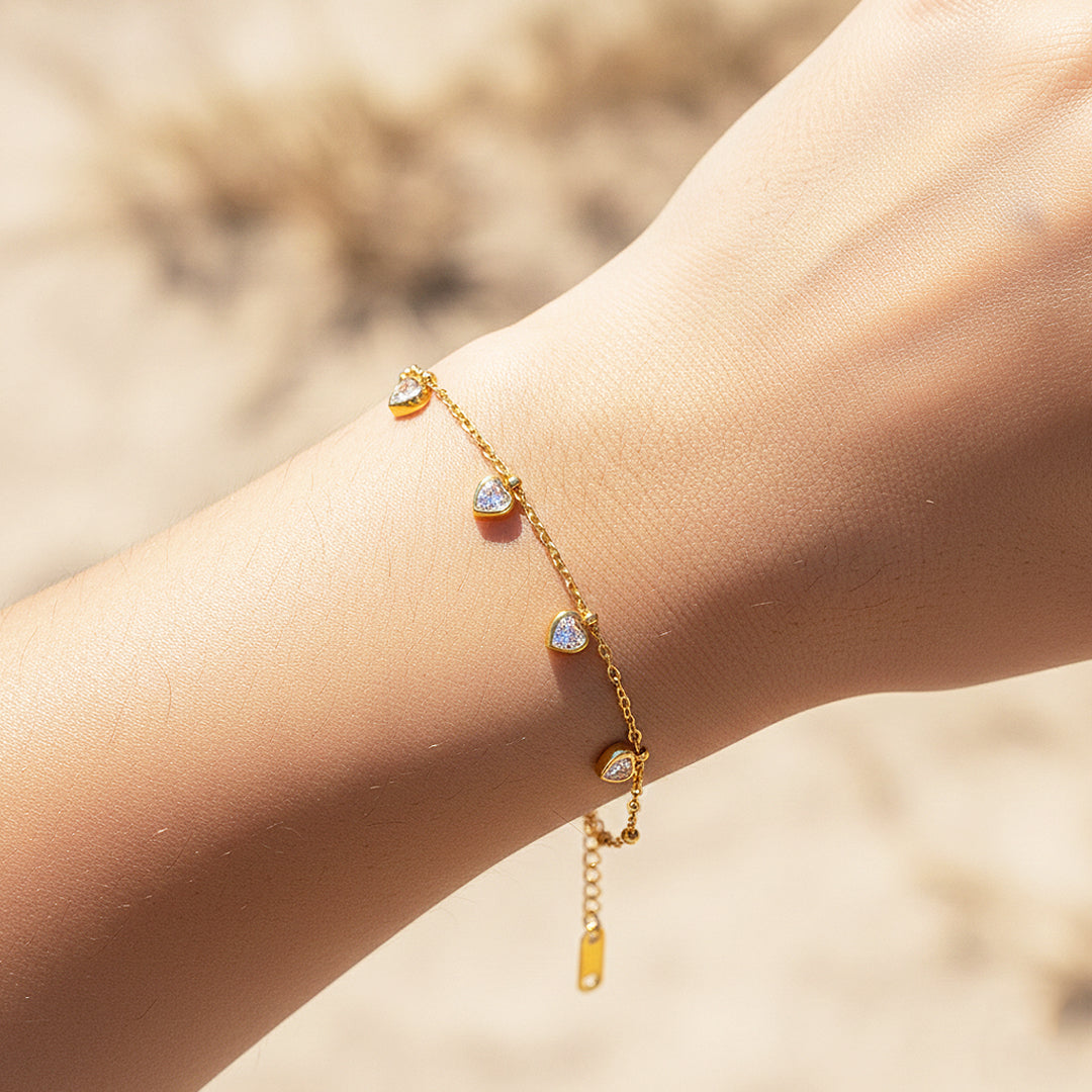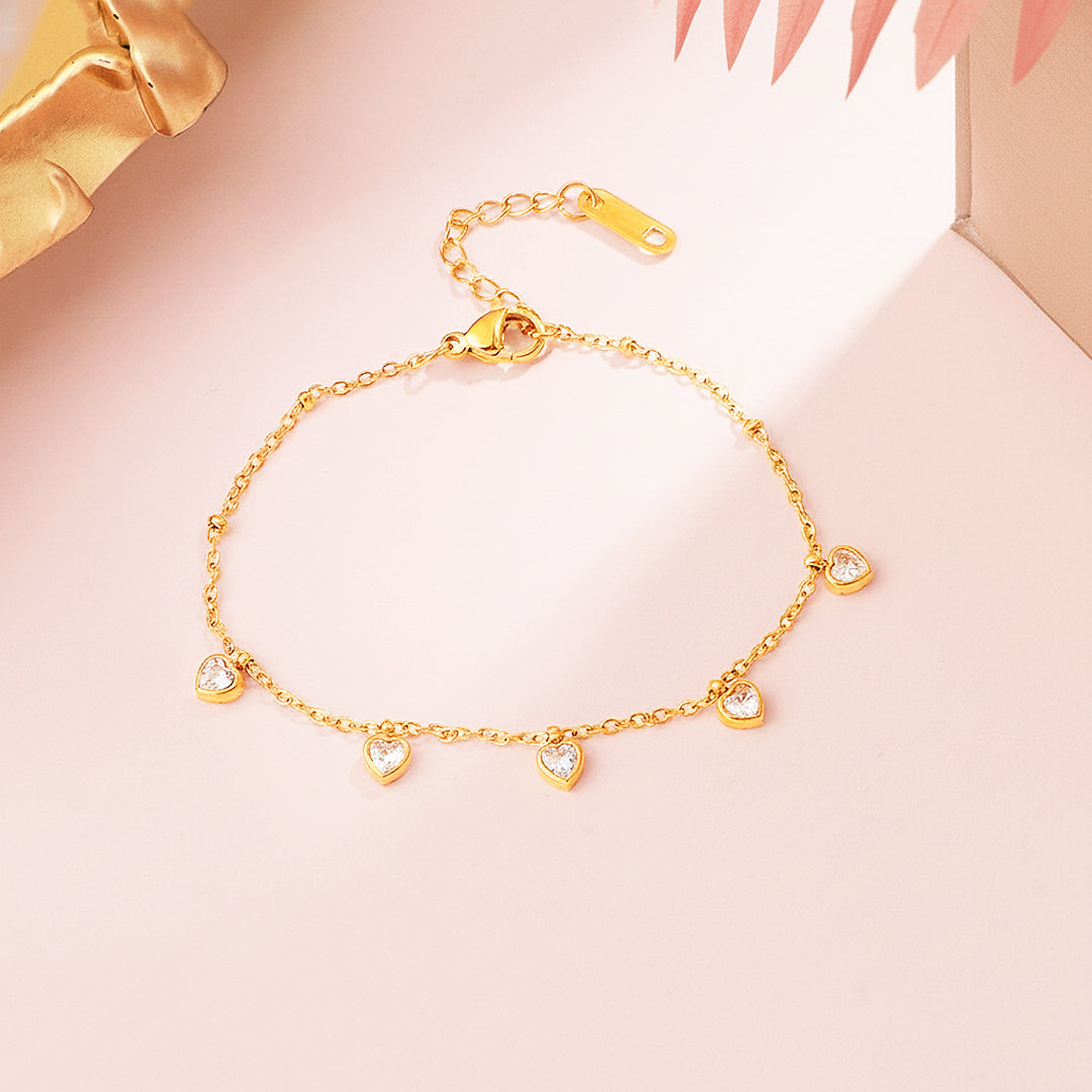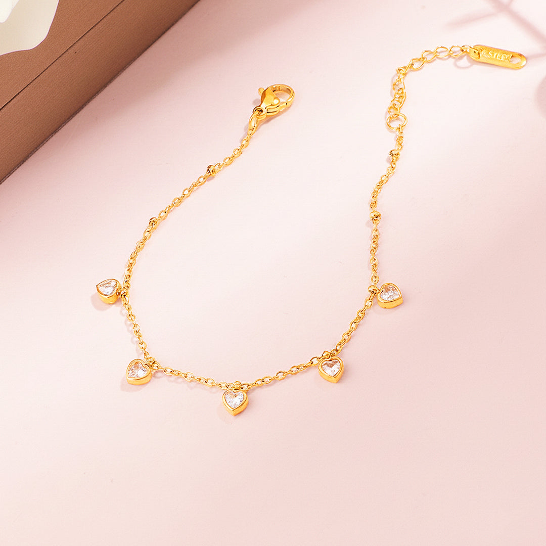 Delicate, luminous, and irresistibly romantic — the Luxe6517 Bracelet is designed for the woman who loves elegance with a soft, feminine touch. Five petite heart-shaped drops, each set with brilliant AAAAA zircon stones, shimmer gently along a dainty gold chain, catching the light with every movement. The polished titanium steel base ensures exceptional durability, while the 5-layer electroplating gives it a rich, lasting golden glow that resists tarnishing and stays beautiful through everyday wear.