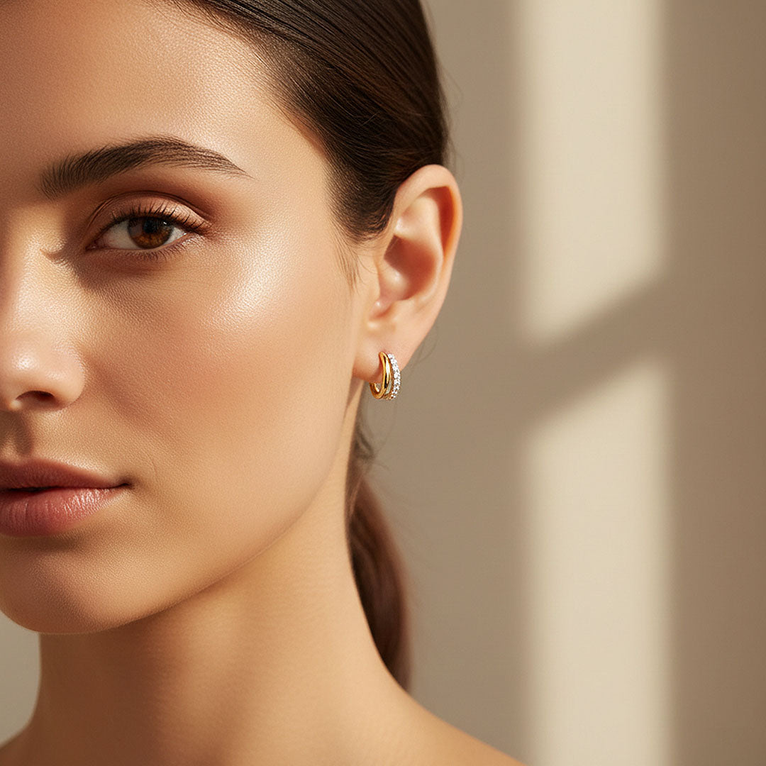 Perfectly proportioned for comfort and versatility, these earrings sit beautifully on the ear, making them ideal for both daily wear and elevated occasions. Finished in radiant 18K gold plating or timeless silver, the Luminous Curve Earrings embody understated glamour, premium craftsmanship, and enduring brilliance—an essential piece for those who appreciate refined sparkle without excess.