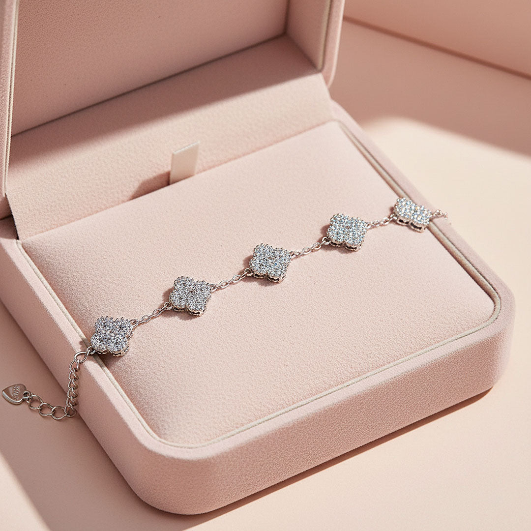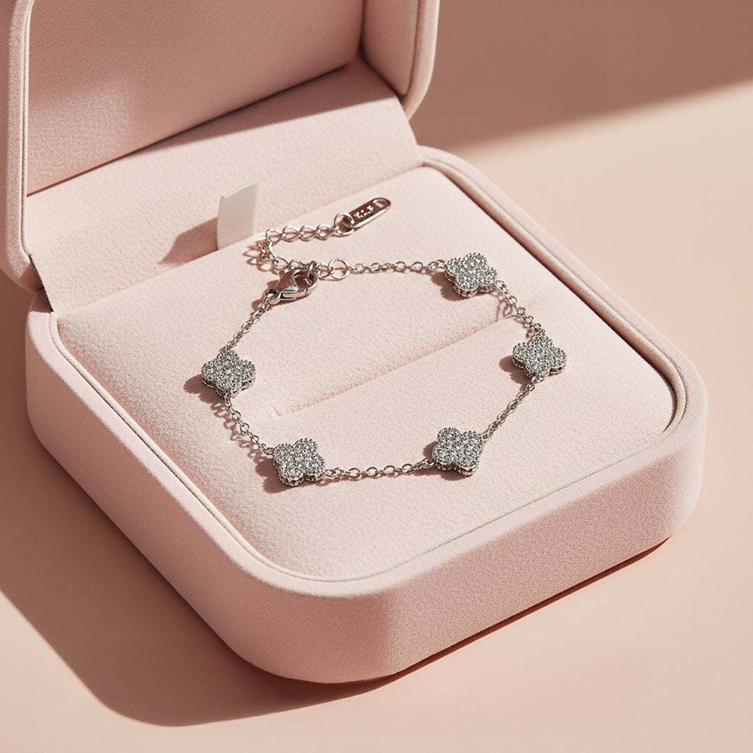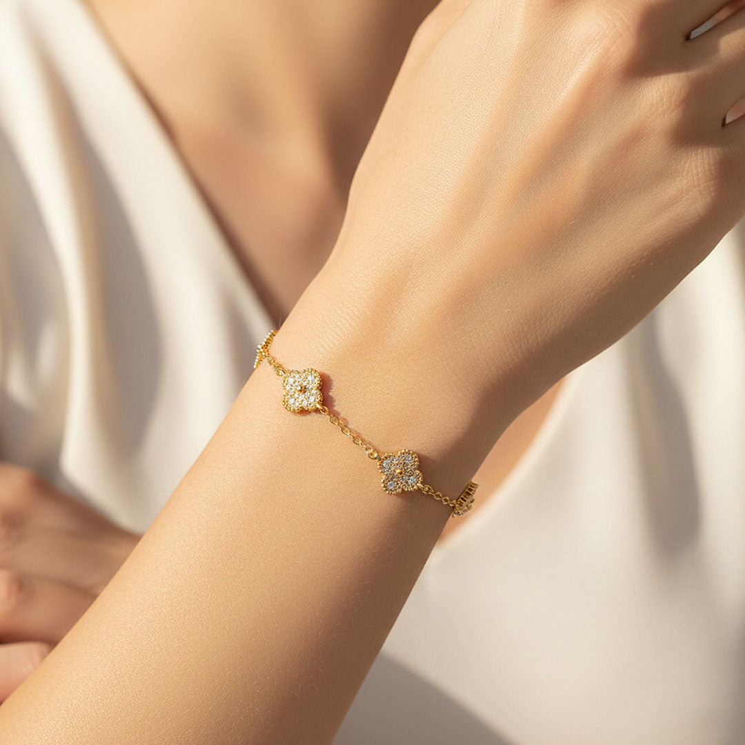 Crafted in 925 sterling silver and finished with five layers of electroplating, the bracelet offers a luxurious glow while ensuring exceptional durability and resistance to tarnishing. The fine chain design allows the clover motifs to rest gently against the wrist, creating an airy, feminine silhouette that feels both light and indulgent.