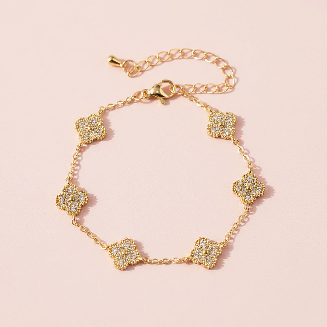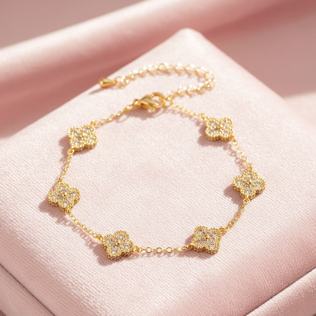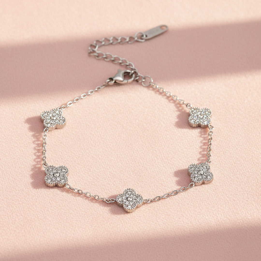 Crafted in 925 sterling silver and finished with five layers of electroplating, the bracelet offers a luxurious glow while ensuring exceptional durability and resistance to tarnishing. The fine chain design allows the clover motifs to rest gently against the wrist, creating an airy, feminine silhouette that feels both light and indulgent.