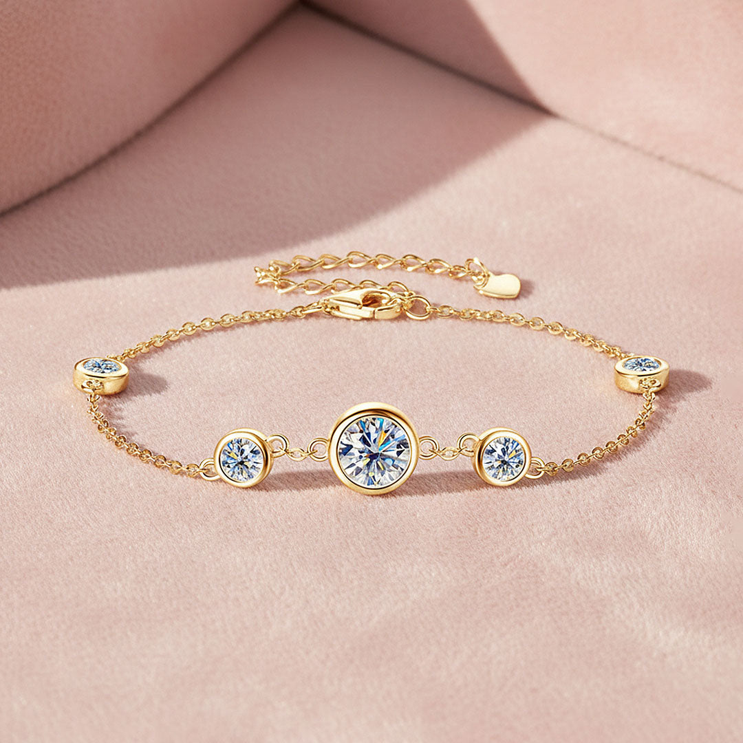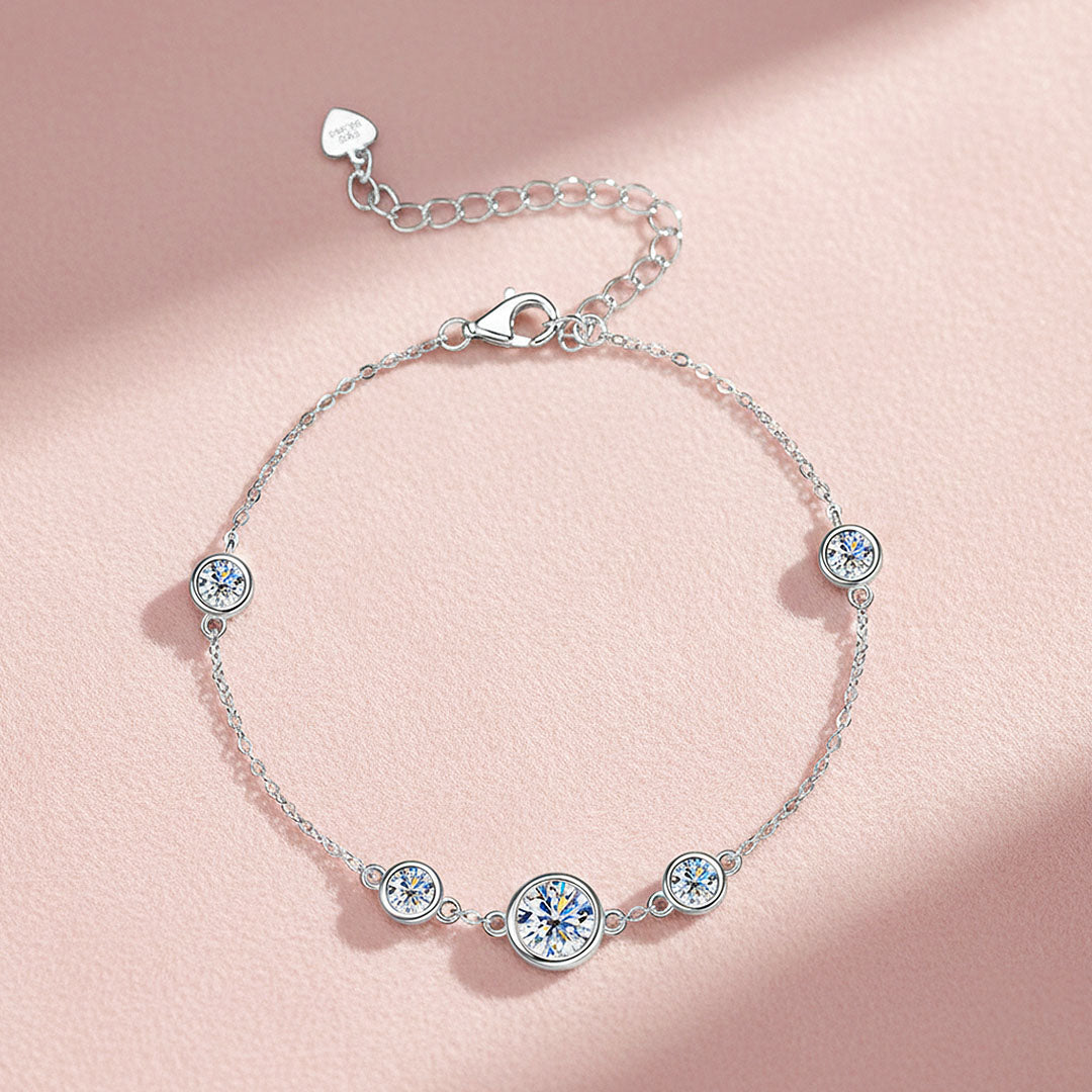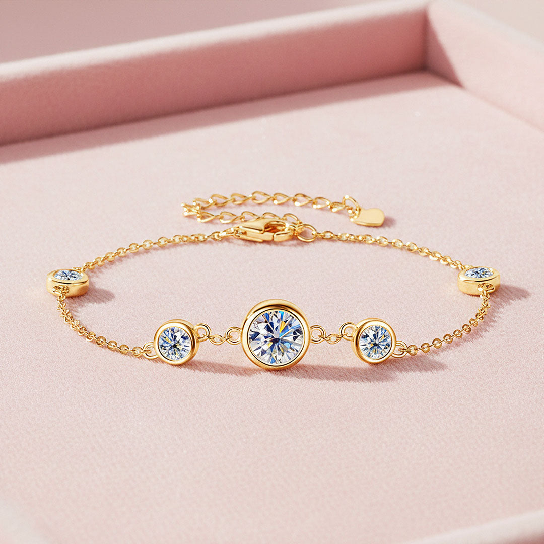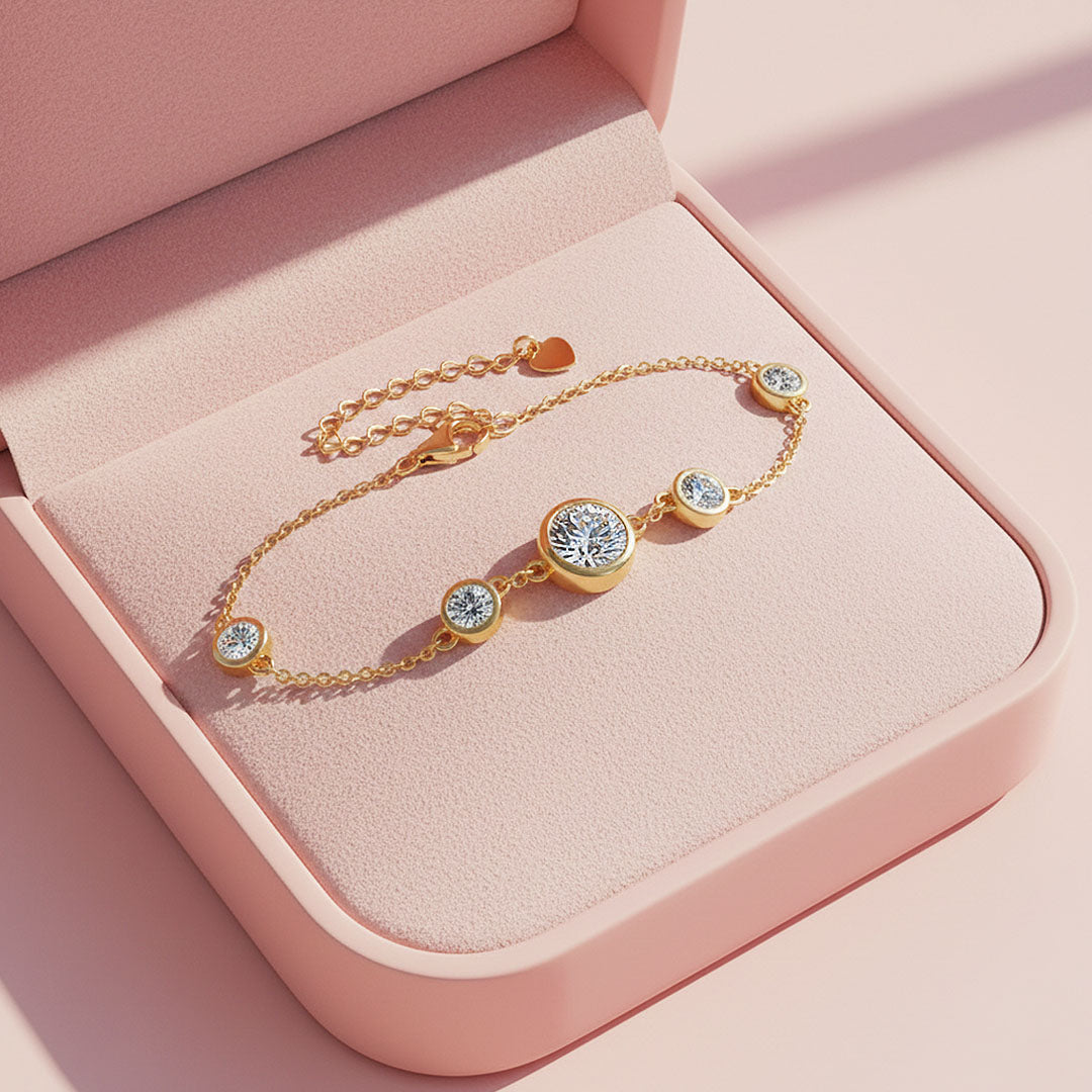 Prm9134 – Bezel Radiance is a refined expression of modern luxury, designed to highlight brilliance in its purest form. Featuring a beautifully balanced arrangement of bezel-set moissanite stones, the bracelet draws the eye to its luminous 6.5mm centre stone, gracefully complemented by four perfectly proportioned 4mm stones. The sleek bezel setting enhances each stone’s fire and clarity while offering a smooth, contemporary silhouette that feels effortlessly elegant on the wrist.