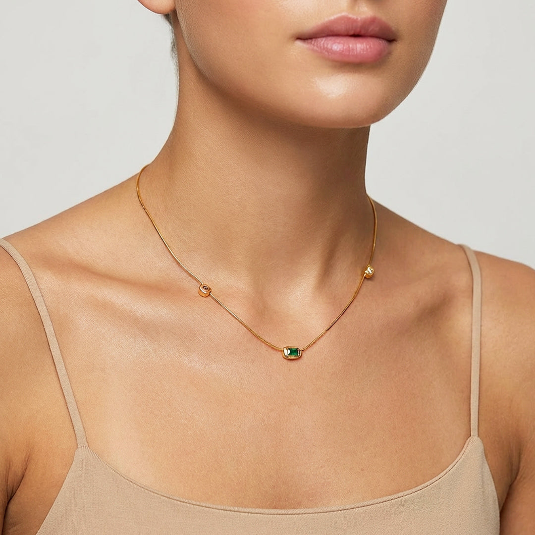 Three bezel-set Diamond Simulants — a round amber, a square white, and a rectangular emerald green — spaced evenly along a flat gold snake chain. The mix of stone shapes and colours gives the necklace an intentional, collected quality that feels more editorial than expected. The snake chain adds to the modern appeal, lying flat against the skin with a smooth, substantial presence. It's the kind of necklace that pulls an outfit together without overshadowing it — versatile enough for daily wear, interesting enough to be noticed.