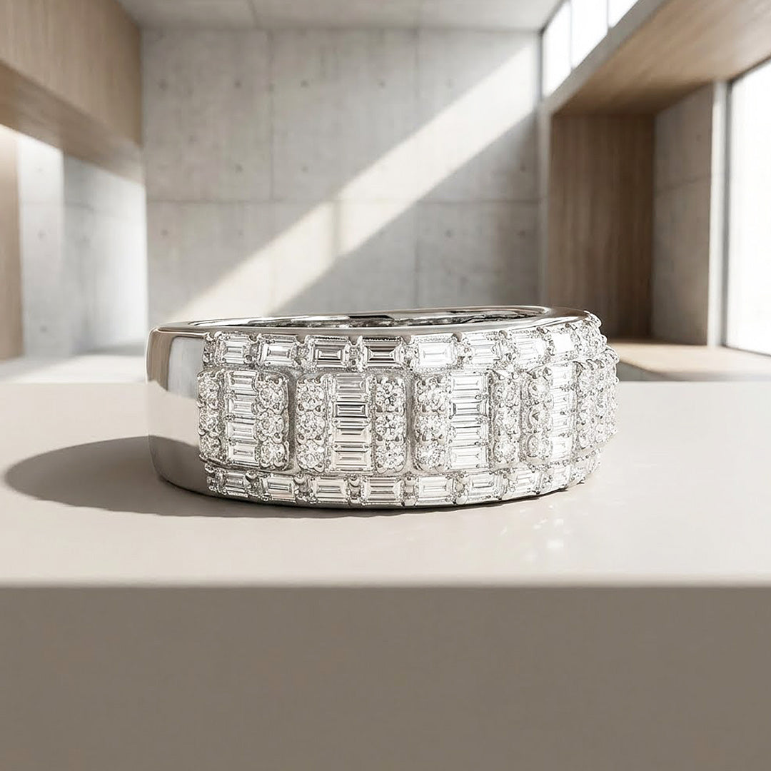 - Round Pavé Accents — Micro pavé stones frame the baguette clusters, adding depth and continuous sparkle across the band