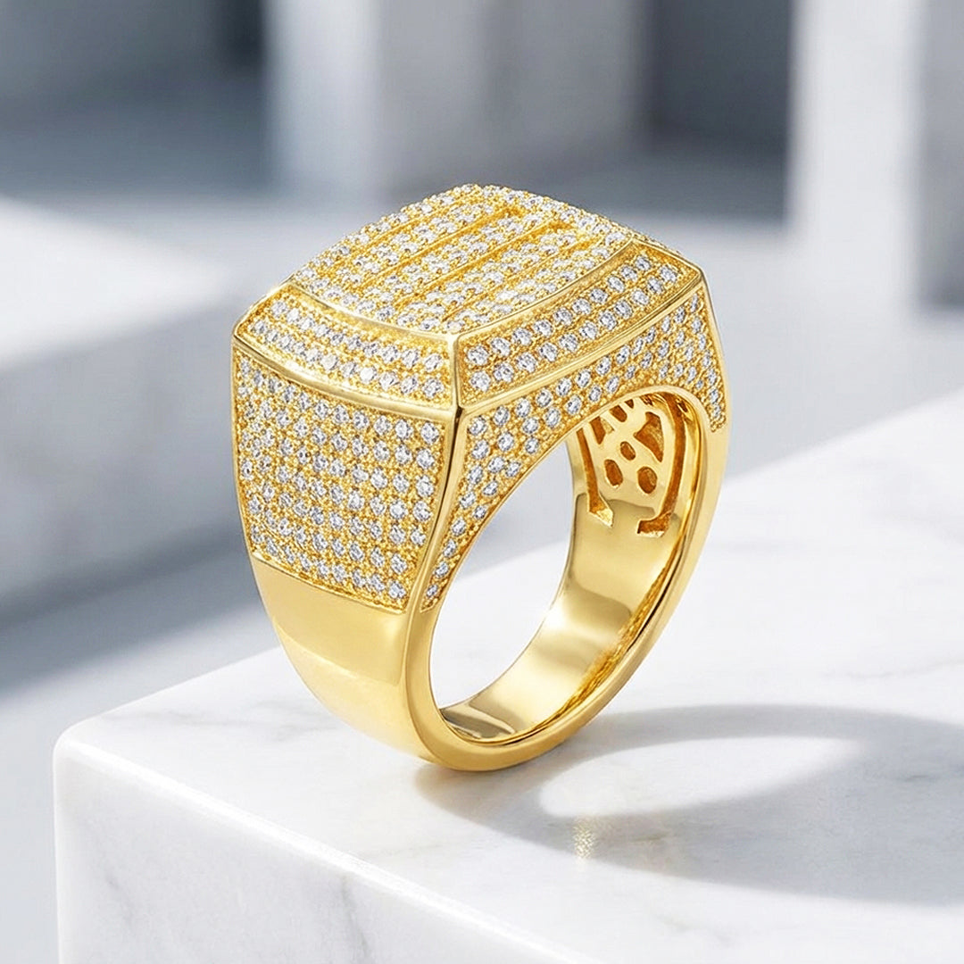 Two colours, one level of impact. This fully iced cushion signet ring covers every visible surface — raised centre face, angled side panels, and tapered shoulders — in round Moissanite pavé, with clean silver rails defining the geometric edges of the face. Every stone is genuine Moissanite, D Colour and VVS1 Clarity, set in solid 925 Sterling Silver with five layers of electroplating. Available in silver or gold finish, it's the same ring, two completely different personalities — and either way, it commands the room.