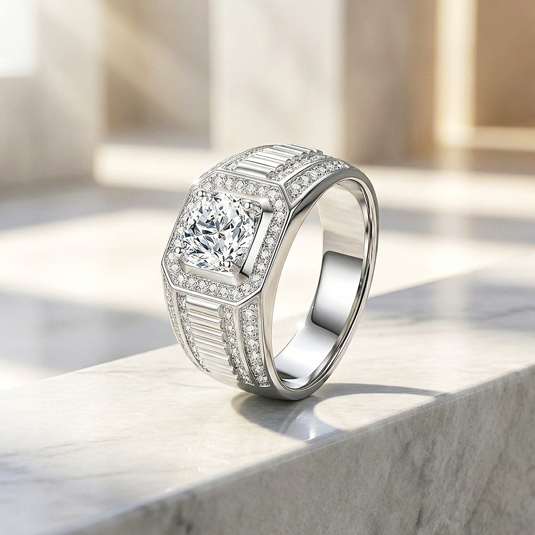 The band does as much work as the stone here. Three raised ridges run the length of each shoulder, converging at a square mount that holds a single 1 Carat round Moissanite in a four-prong setting — no halo, no accents, nothing competing for attention. Just the stone and the architecture around it. D Colour, VVS1 Clarity Moissanite in solid 925 Sterling Silver with five layers of electroplating. It's the kind of ring that looks equally at home on a construction site Monday and a client dinner Friday.