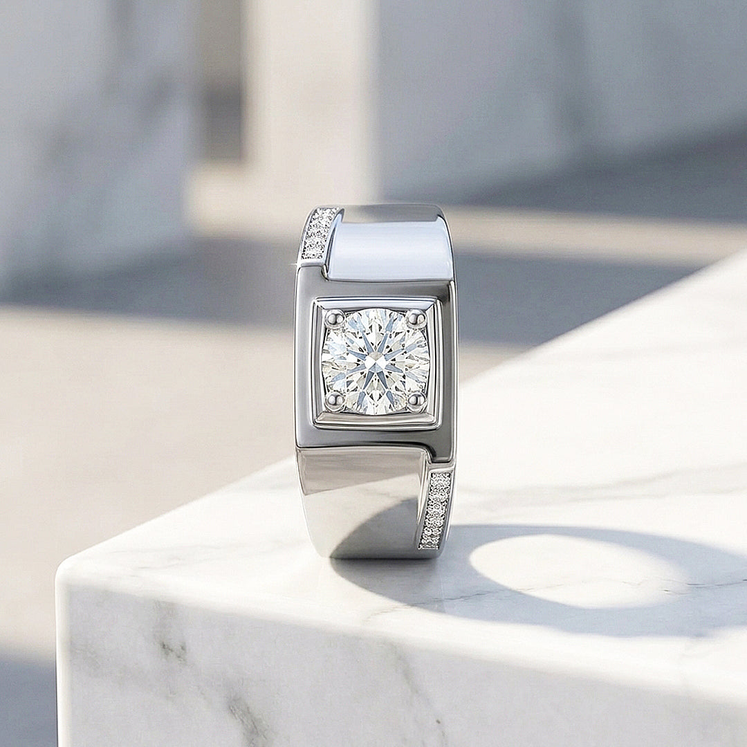 Bold in structure, precise in detail. A 1 Carat round Moissanite sits within a raised square frame at the centre of a wide polished band, four-prong set and commanding full attention. Two angled Diamond Simulant pavé channels cut diagonally across the upper and lower shoulders — just enough sparkle to frame the piece without competing with the main stone. D Colour, VVS1 Clarity Moissanite in solid 925 Sterling Silver with five layers of electroplating. A ring that looks like it was designed with a specific man in mind — one who knows exactly what he wants.