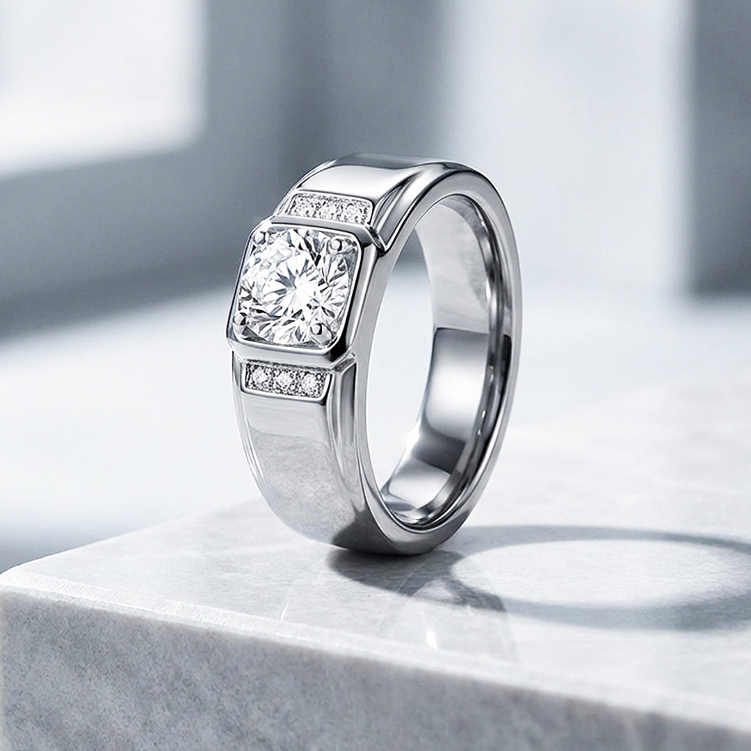 The centre stone leads, and everything else follows. A 1 Carat round Moissanite is prong-set slightly raised at the heart of this ring, with two large square pavé panels of Diamond Simulant flanking either side — separated from the stone by clean vertical silver dividers that give the face a precise, grid-like structure. The wide flat band keeps the silhouette grounded and modern. D Colour, VVS1 Clarity Moissanite in solid 925 Sterling Silver with five layers of electroplating. A ring that photographs well and wears even better.