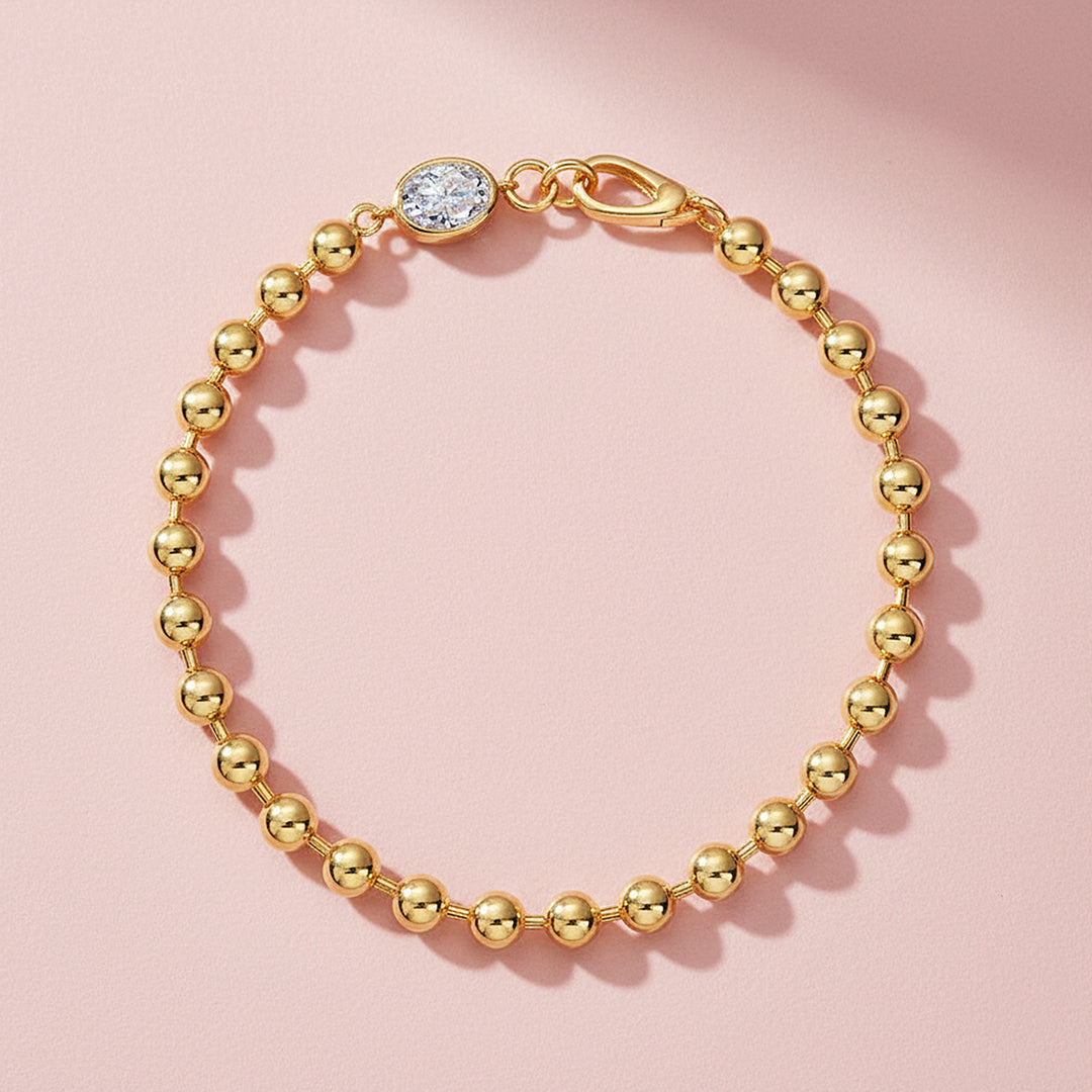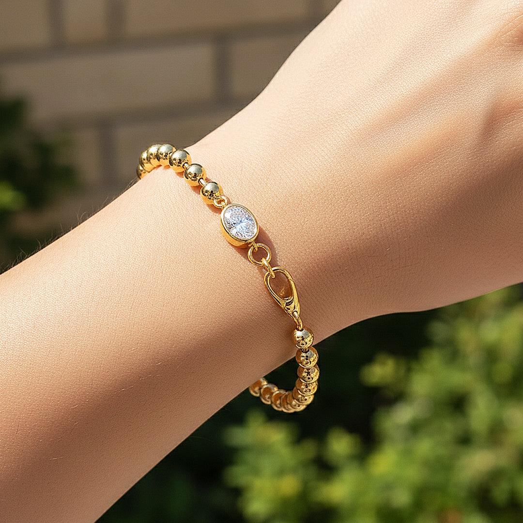 Prm9141 – Aurelia Glow is a refined statement of modern elegance, designed with polished spherical beads that create a seamless line of radiant gold brilliance around the wrist. At its centre, a luminous D Colour VVS1 Moissanite is delicately set within a sleek oval frame, capturing and reflecting light with extraordinary fire. The contrast between the mirror-like beads and the dazzling gemstone creates a sophisticated harmony — bold yet graceful, contemporary yet timeless.