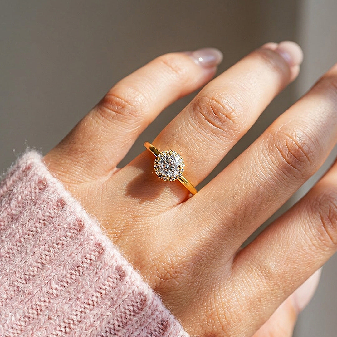 Simplicity and sparkle in equal measure — PRM7180 sets a 0.5 carat Moissanite within a low-profile round Diamond Simulant halo, sitting flush against a plain polished yellow gold band. The halo amplifies the center stone's presence significantly, making the overall look far more substantial than the carat weight alone would suggest. In direct sunlight, the Moissanite fires brilliantly through the frame — a quality these images capture honestly. The kind of ring that looks expensive without demanding attention, and works just as well dressed up as dressed down.